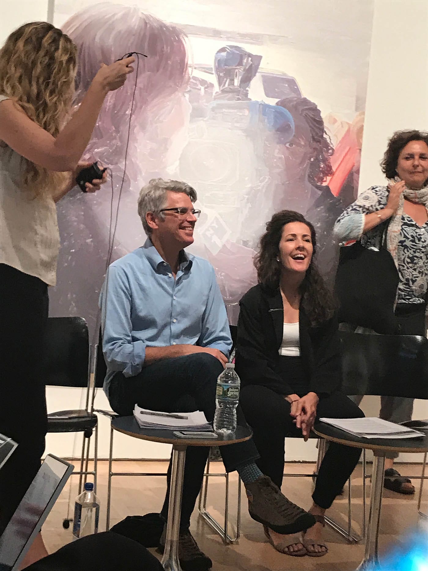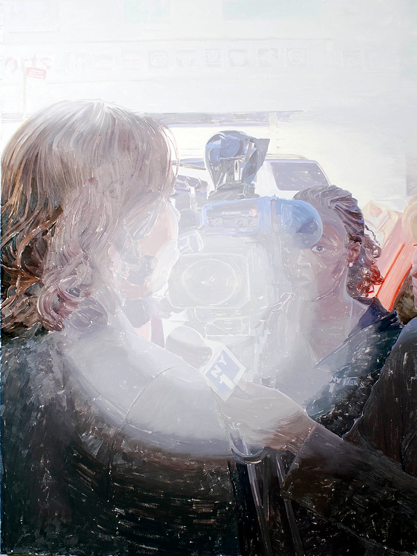 In large, panoramic images of courtrooms, peopled by reporters and cameramen, where legislation shaping our lives and futures plays out, Krashes’s oil paint often congeals into a hazy glare or a stuffy, clouded morass suggestive of bureaucratic inertia. The works draw attention to the artifice of pomp and ceremony, reminding us that mediated experiences are as much a part of our perceptions as lived, corporeal experience. Pictures of both law and order as staged sets and powerfully real events are delivered like sequences in a Brian De Palma film: through projections, atmospheric fog, film gels, skewed vantage points, and natural and artificial haloed light. Krashes returns again and again to motifs of huddled masses, banks of cameras and microphones, walls of police, face-to-face collusion between the press and politicians, absentee officials, elected authorities, or angelic administrators. Some of the subjects, like the public advocate Letitia James, are revisited in different media, as if being electronically rebroadcast or recalled in dreams.