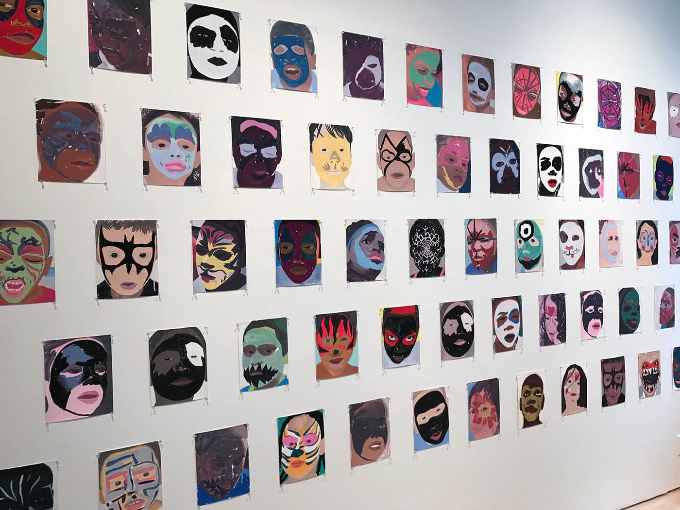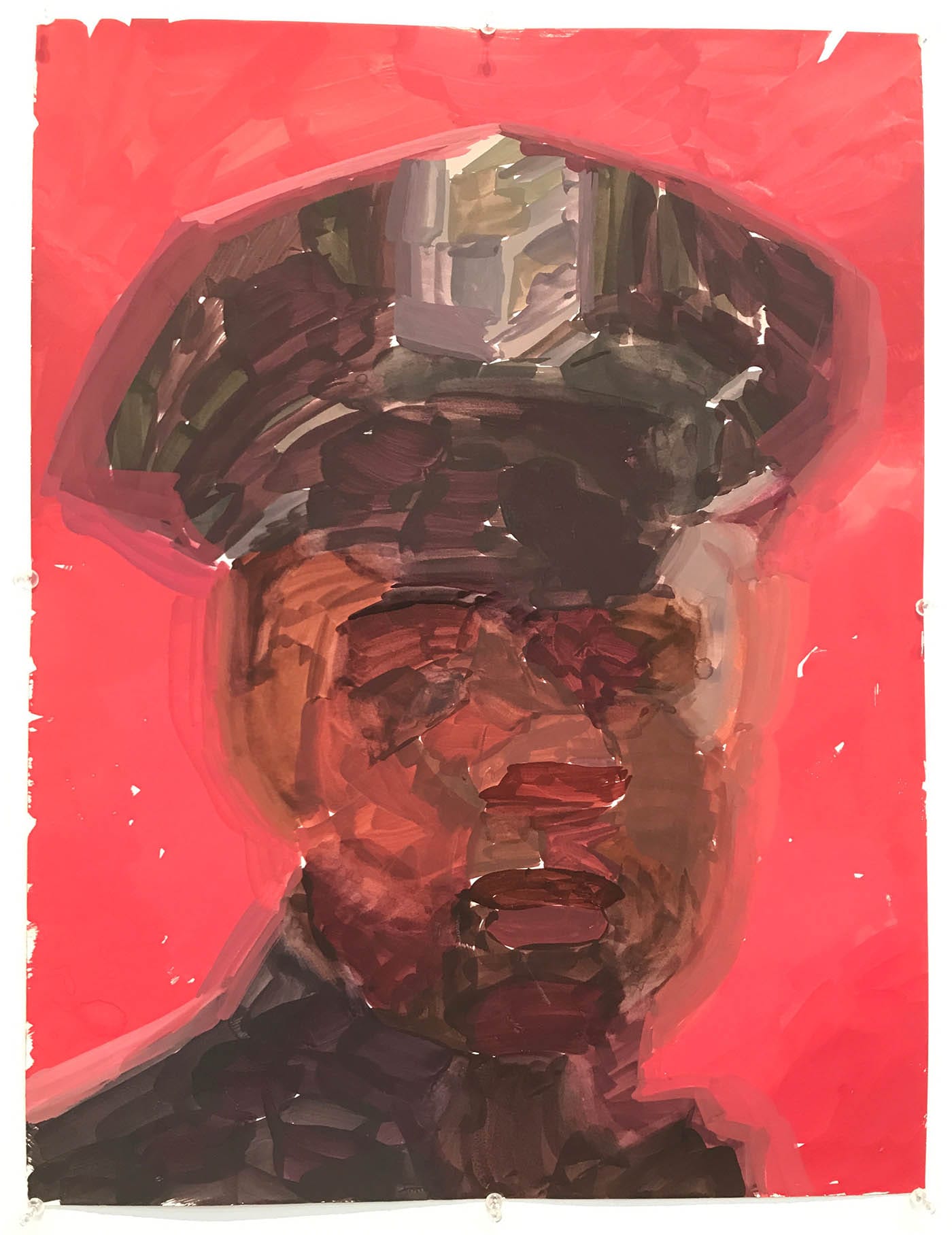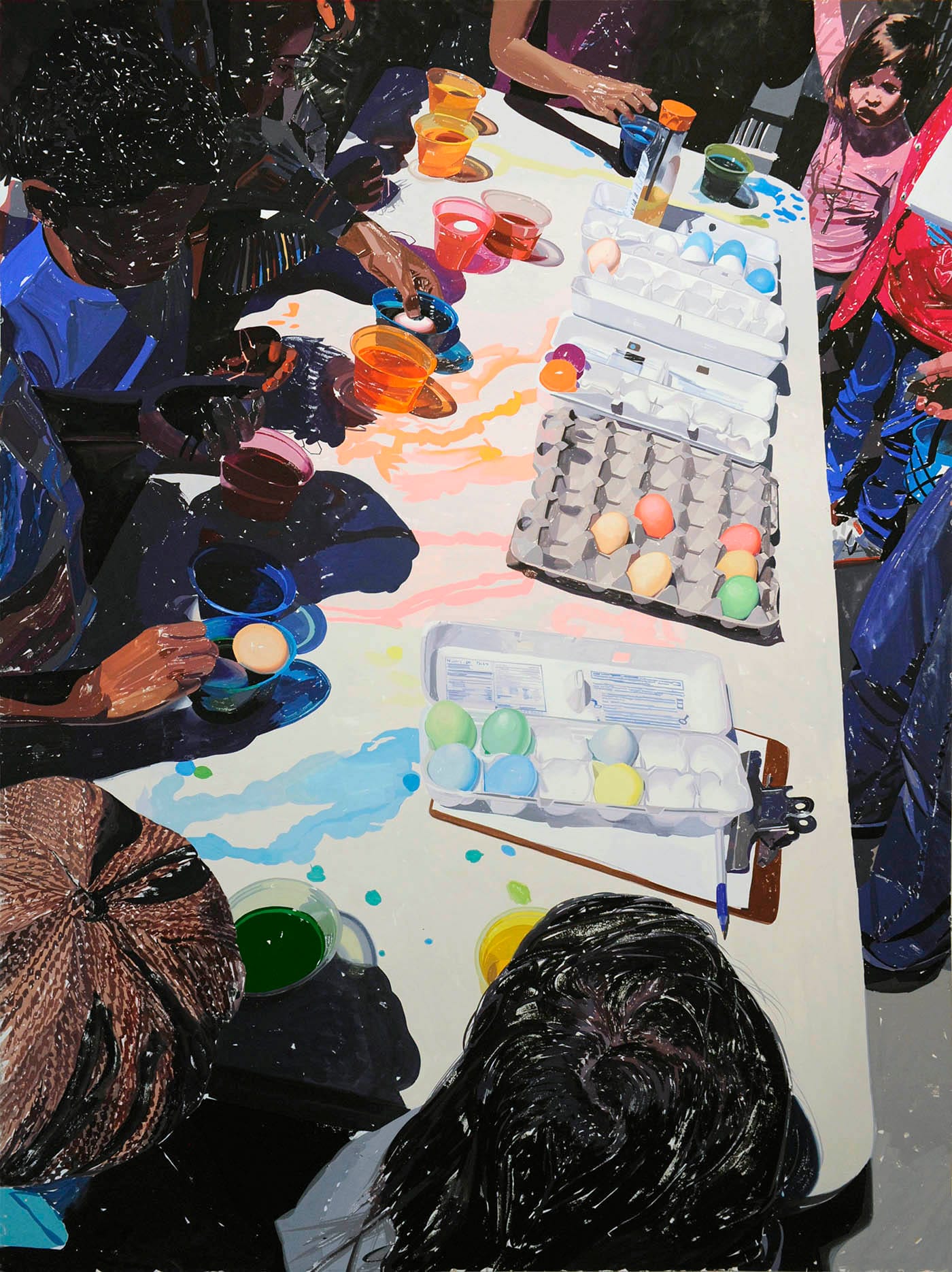 On the other end of the spectrum are the regular folks whose lives are upended by gentrification, and here Krashes’s paintings of neighbors and community are more celebratory. When he creates pictures of adults and children engaged with arts and craft mediums, designing banners and signage dribbled in tempera, or splashing around face paints and Easter egg dyes, he capitalizes on the chalky, opaque medium of gouache on paper to create a visual analogy. He crops in close on a child’s face or letterform, varies his brush size, and thins, sweeps, and overlays the paint so the viewer senses the intimacy of the act. Larger images of block parties with kids at play, are tilted, asymmetric compositions that blur the line between representation and abstraction. As figurative works, these share an affinity with action paintings — dynamic human presence materializes through centralized colors, patterns, and movement, a manifestation of the figures’ efforts and imagination.