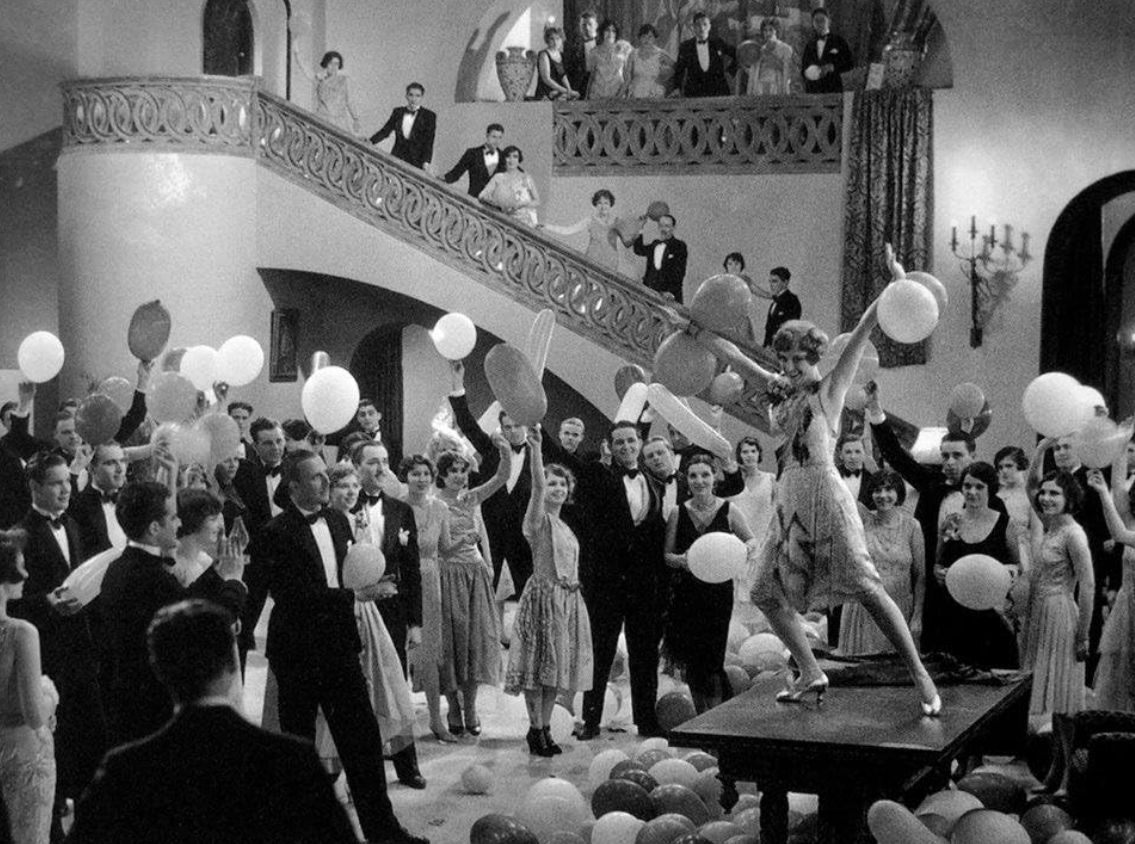 Gibbons is one of the more influential of the lesser-known film artists. He would amass more than 1,500 credits over his nearly four-decade career, a testament to the dizzying pace of industrial film production during Hollywood’s golden age. Even if you aren’t a classic Hollywood aficionado, you know his work — he’s the one who designed the Oscar statuette. Our Dancing Daughters is one of more than 15 films he’s credited on as art director in 1928 alone. Beyond being Art Deco’s US debut, the film was also the breakout role for Joan Crawford, the most notable of the titular dancing daughters. The movie does not feature spoken dialogue but does have a synchronized soundtrack, making it an early novelty of the burgeoning sound era. This aspect is important, since conveying the music directly makes the characters’ partying lifestyle much more vivid and immediate. Indeed, the film was formative in the image of the flapper.