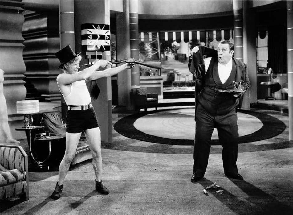 Upperclass-lowerclass relations (emphasized through a recurring motif of characters ascending and descending a dazzling staircase spiraling around a grand chandelier) receive a much more lighthearted touch in Ernst Lubitsch’s Trouble in Paradise (1932), in which romantic and criminal partners become part of a love pentangle with their wealthy industrialist target and her two suitors. And the upper crust receives an expected razzing from the Marx Brothers in Animal Crackers (1930), as Groucho, Chico, and Harpo run wild over high society, a Modernist mansion making for an excellent playground.