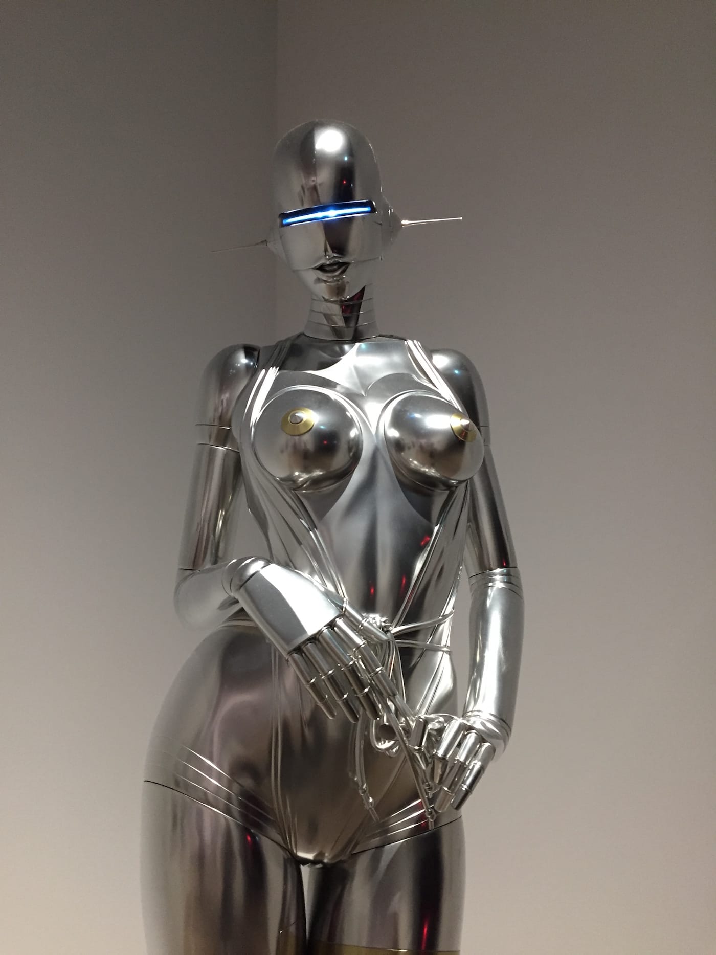 As the exhibition progresses, we’re treated to a veritable galaxy of objets — mostly contemporary art wrestling with the same questions, but informed by the technology and knowledge of the universe we have now. Webs of metal and lights rotate in sync with Earth. Photographs attempt to find god in neutrinos. Art and artifacts contend with life beyond our solar system, from interpretations of old Japanese fables about alien vessels containing small women, to old American pulp fiction magazines detailing life on Neptune. A sexy robot, with chrome curves, whose voluptuous metal figure makes the light reflected onto her surface resemble something lurid, like splotches of bodily fluids, on her gold pumps.