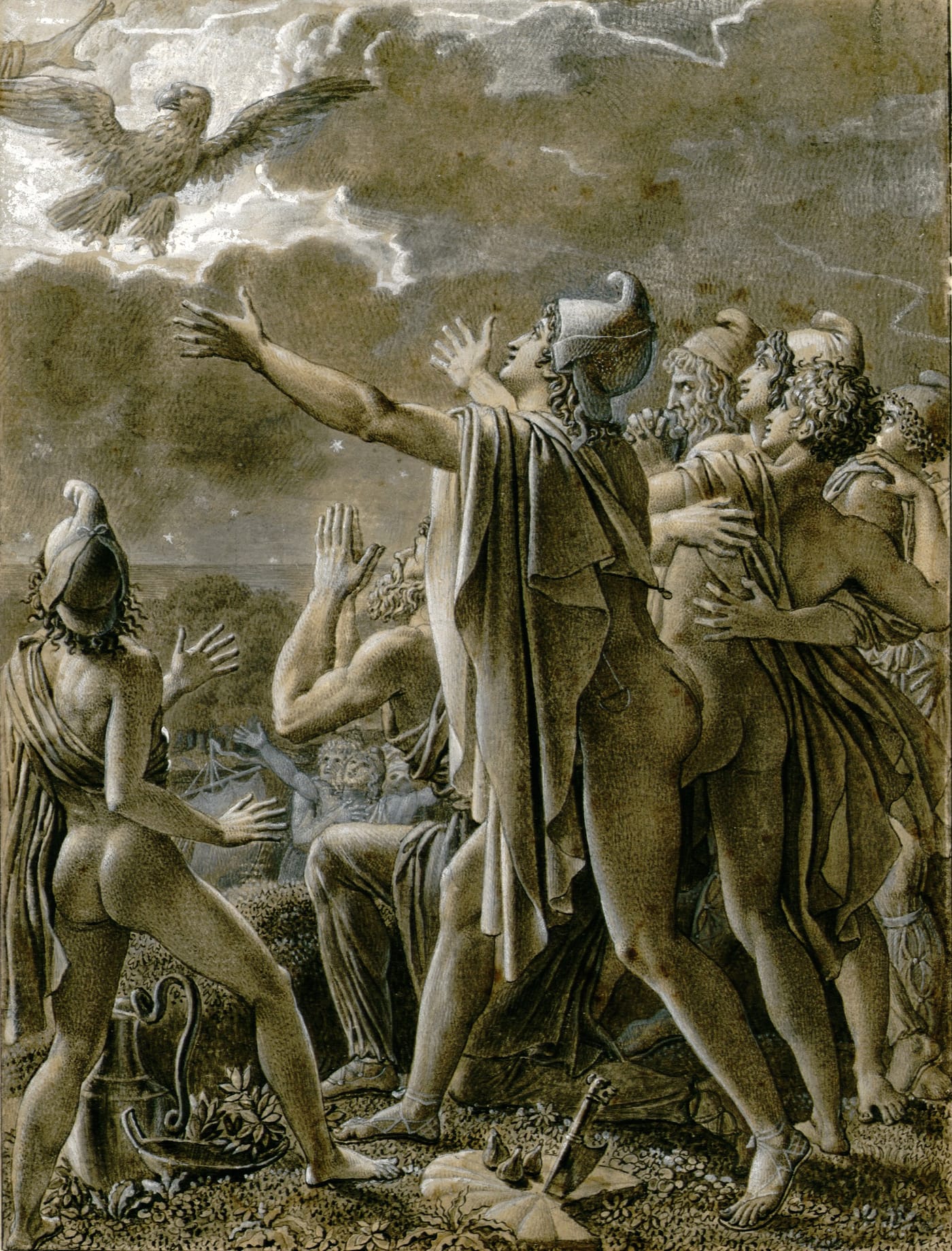 Following David’s grand paragon, the art of the nascent French Republic seized upon Ancient Rome for examples of artistic representations of virtue and heroism. We see this certainly in Jean-François-Pierre Peyron’s electrifying drawing “Study for Young Athenians and Athenians Drawing Lots to be Delivered to the Minotaur” (circa 1778). David’s classical revivalism — coupled with revolutionary fervor — can be seen as new and distinctive for its emphasis on historic knowledge of ancient art and architecture. This new-old knowledge was enhanced by the 18th-century excavation of Herculaneum and Pompeii and the exploration of the ancient monuments of the Greek islands. So with the birth of republican patriotic ideals, many artists were inspired to draw group scenes based on the moralizing myths of Greco-Roman antiquity. We see this unmistakably in Philippe-Auguste Hennequin’s drawing “Orestes’ Remorse” (circa 1800), based on the Greek Orestes myth; in Anne-Louis Girodet de Roussy’s dramatic “Aeneas and Companions in Latium” (circa 1790-1793) drawing; and in Jean-Guillaume Moitte’s “Venus, Persistently Irritated with Telemachus, Asking Jupiter for His Demise” (1780).