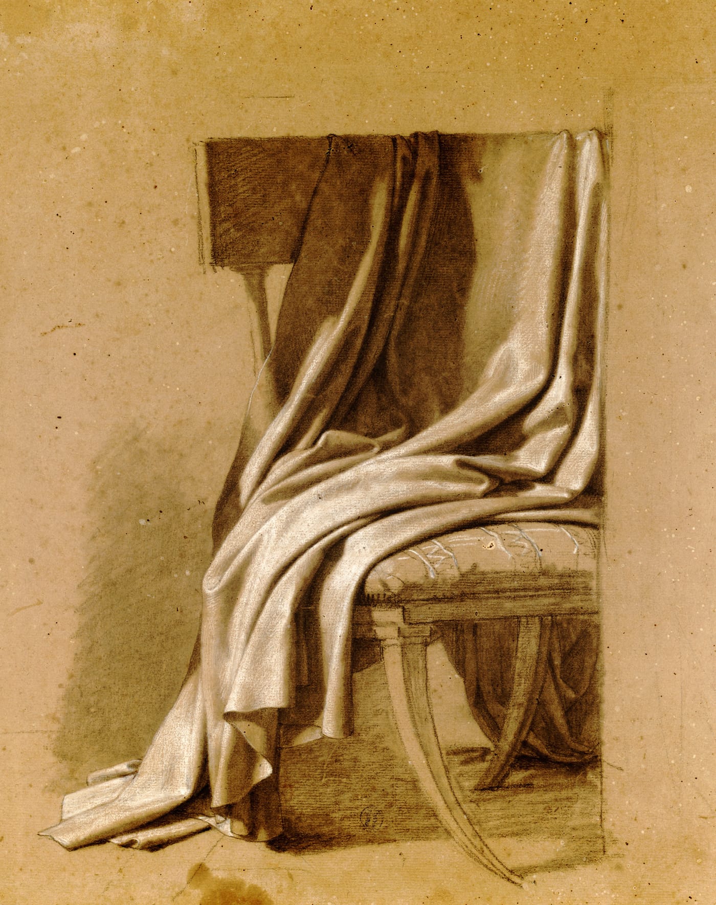 Later, contradictory, intimately serene scenes, like Fabre’s “Study of Antique Chair Covered with Drapery” (1796), inspired by the art of classical antiquity, communicate more settled hopes for the new French Republic that grew out of giddy political-social upheaval.