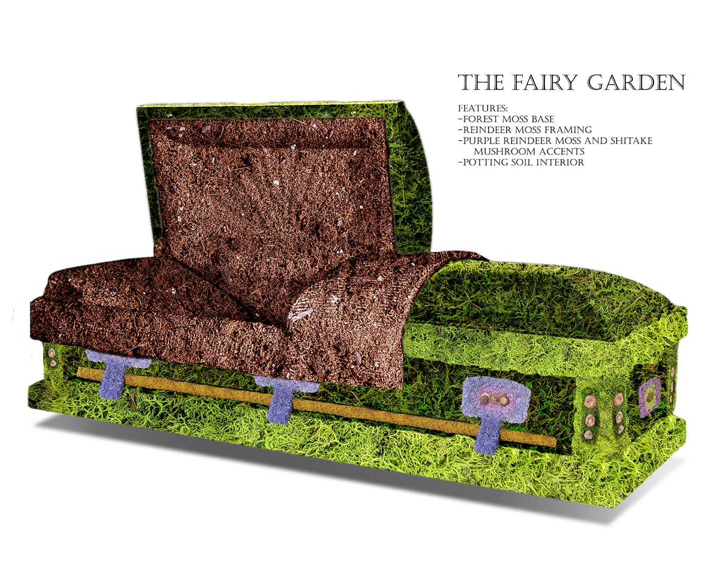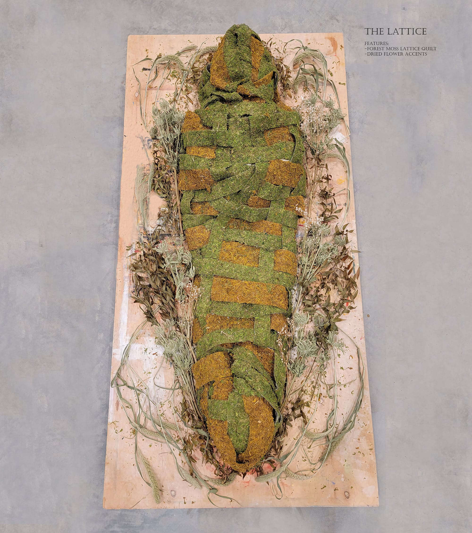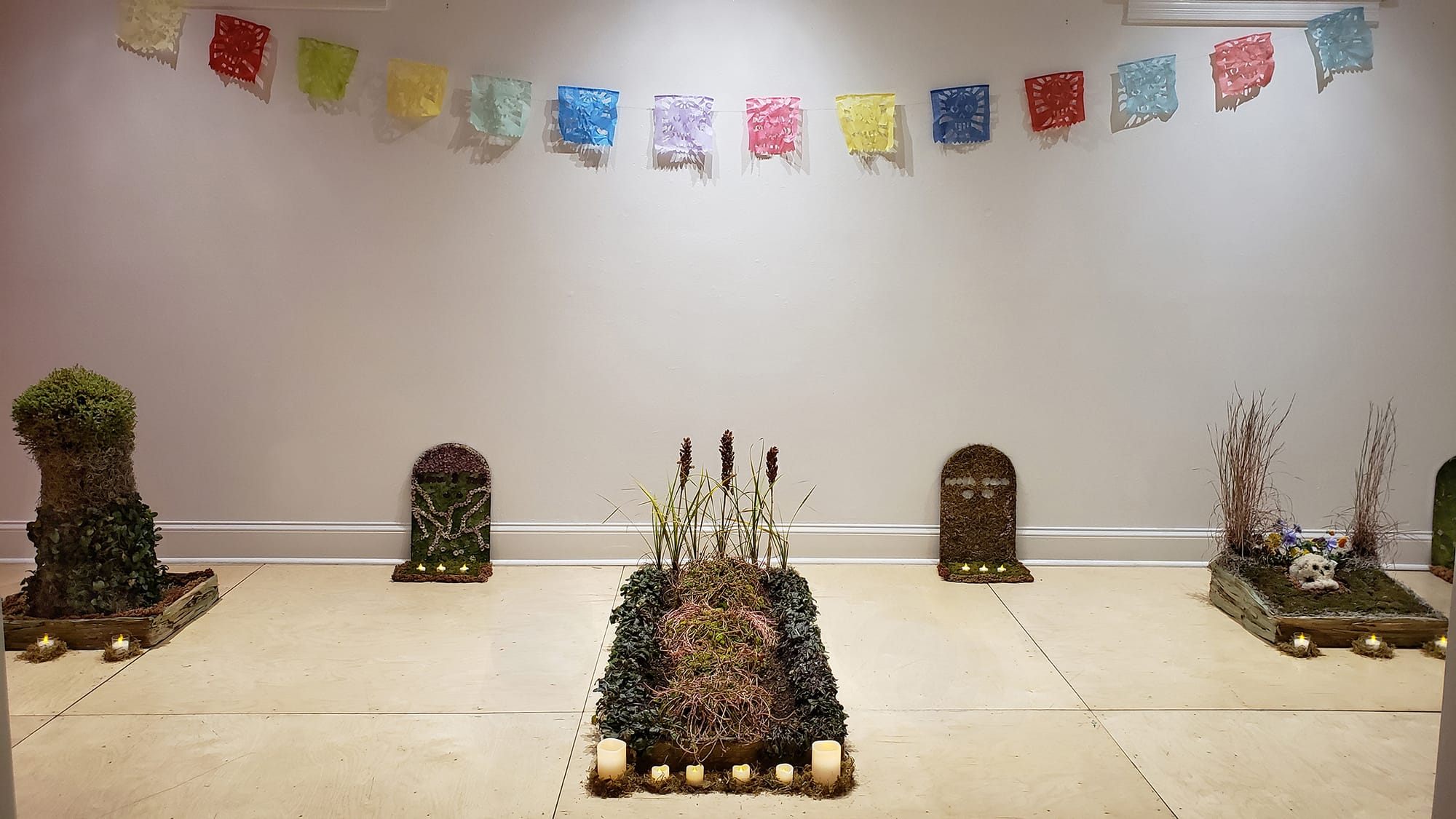 In my own contribution to deathwork as an artist, I’ve developed works addressing my personal experience of loss, and over time, looked more broadly at shared rituals and norms in memorialization. Aquí Descansamos began as a living cemetery composed of floral sculptures that mirrored the shapes of common grave markers. In contrast to the somber, grey-stone visuals of conventional cemeteries, these alternate memorials highlight color, growth, decomposition, and renewal, offering a space to celebrate life’s vibrancy while acknowledging its temporary and ever-changing nature. An expansion of the series evolved to incorporate burial vessels including caskets, urns, and shrouds, all similarly crafted from organic, ephemeral materials such as moss, soap, sand, seaweed, and beeswax. When installed, these vessels come together in the form of a funeral showroom, creating a familiar yet novel environment in which to consider end-of-life planning as an opportunity for empowerment.