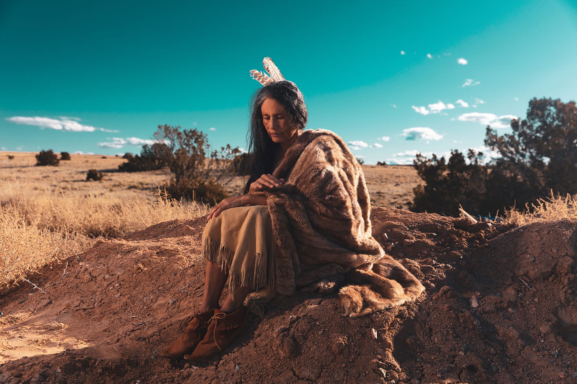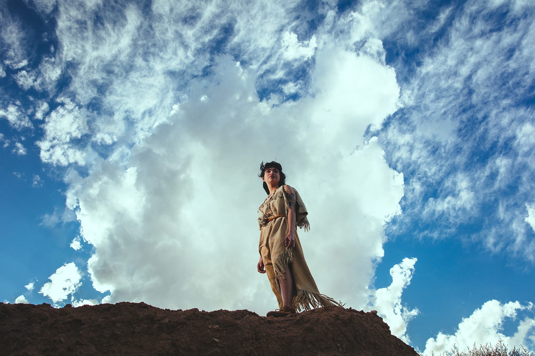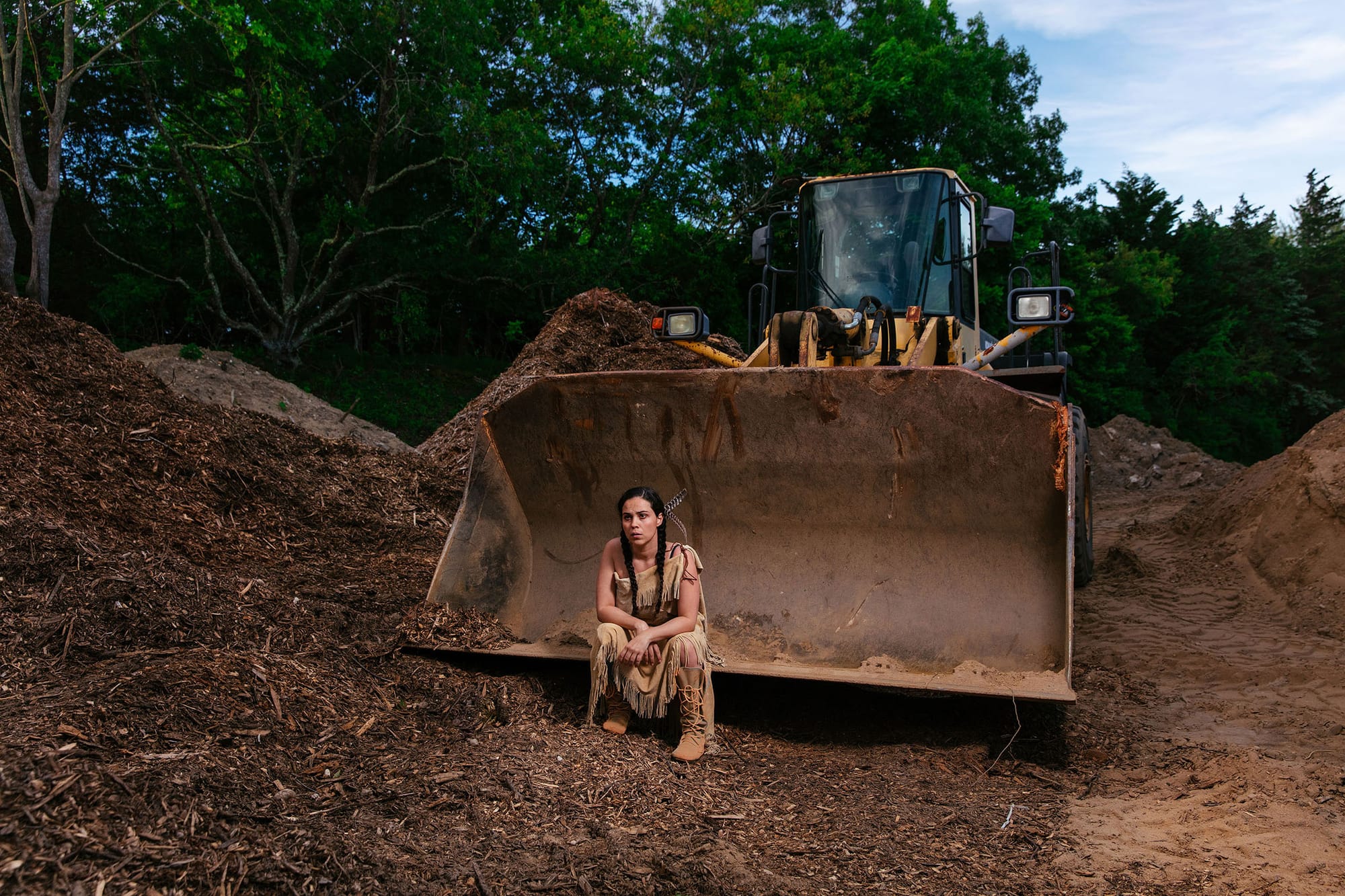The Sacredness of Hills series by Shinnecock artist Jeremy Dennis is based on the recurring desecration of Indigenous burial grounds of his tribal community in Southampton, New York, enabled by a lack of legal protections for “unmarked” burial sites and the economic motivation of real estate. The Shinnecock Hills are the primary location of this recurrence, as they are an expansive traditional burial site for Shinnecock ancestors. Each photograph presents the dual figure of an ancestor and future descendent manifested at the disturbed site, acting as an entry point for awareness of the graves, a call to action to support protections, and preservation of cultural legacy.