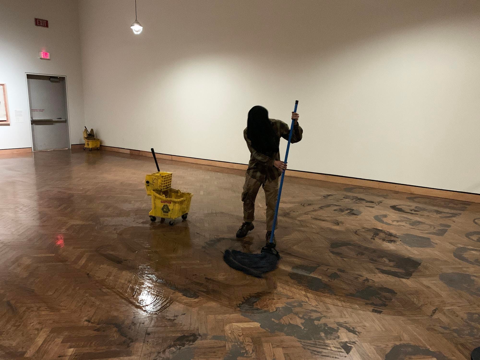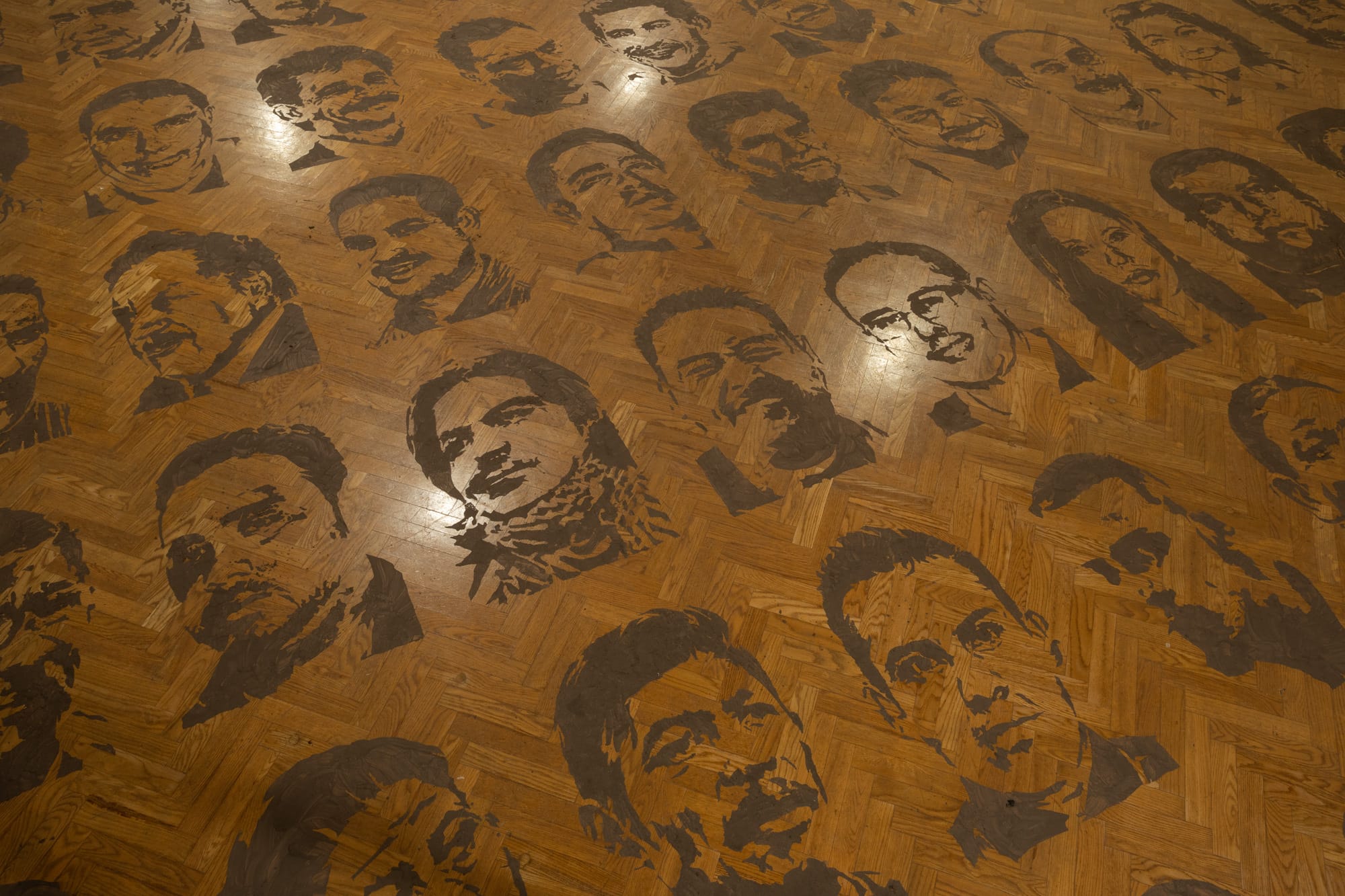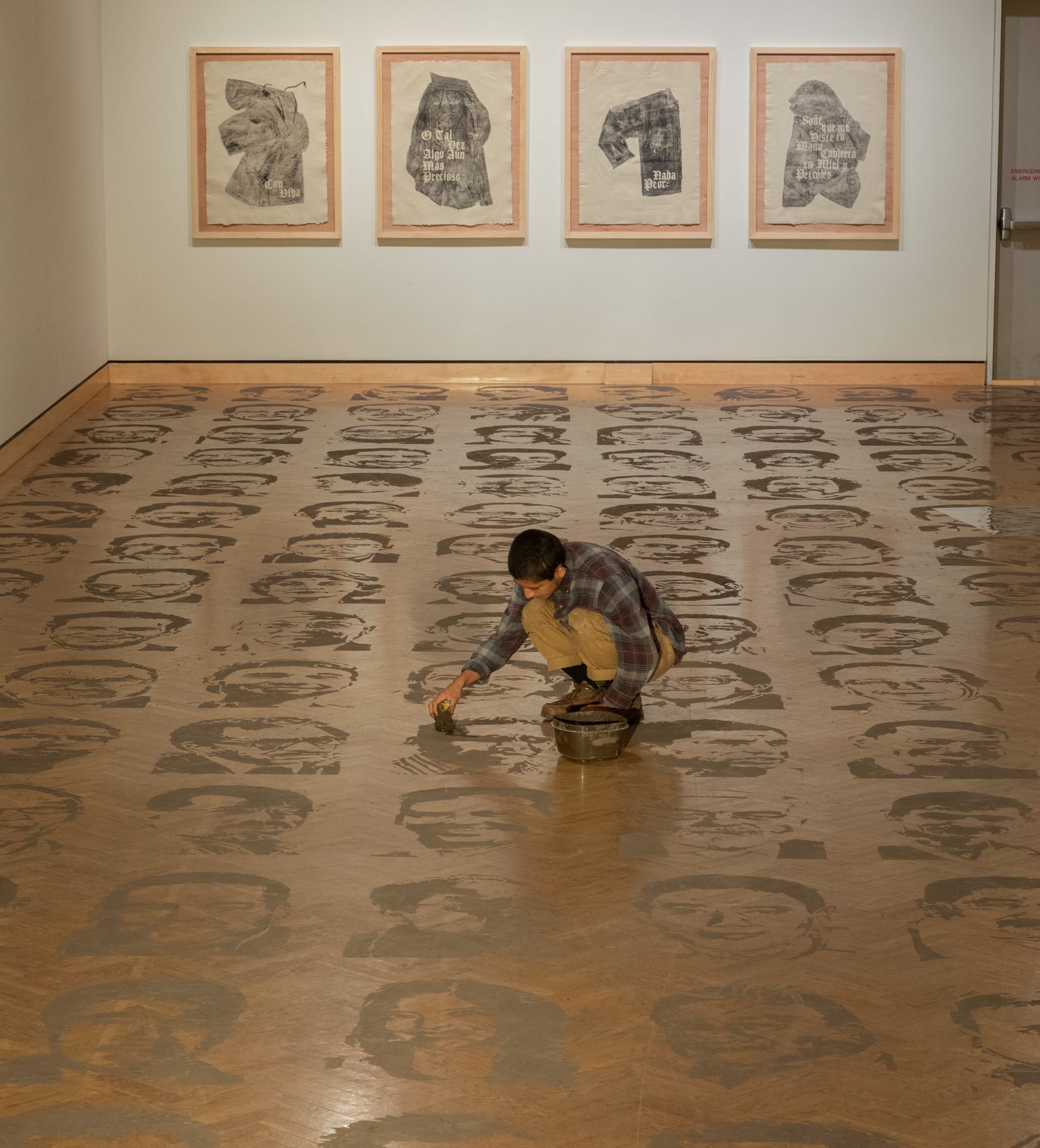 "In Between / Underneath (Entremedio / Por Debajo)" exhibited at the Minneapolis Institute of Art (Mia) features the faces of Mexican journalists who have been murdered or made to disappear through mud prints placed on the floor. Artist Jonathan Herrera Soto made collective memory tangible with each visitor walking over the faces and, in doing so, leaving with pieces of them on the soles of their shoes. In a closing performance, "La Tarea de Reconocer un Cuerpo (The Task of Recognizing a Body)," Herrera Soto mopped the floor, wiping away what was left of the faces while wearing a piece of black fabric over his head. Herrera Soto also makes a point to reclaim the language surrounding death by corrupt authoritarian systems. He noted during an interview for the exhibition at Mia that while this is an act of remembering, “It is not documenting a tragedy. It’s a rendering of what is done very purposefully. It’s a tragedy for us but it’s not accidental.”
