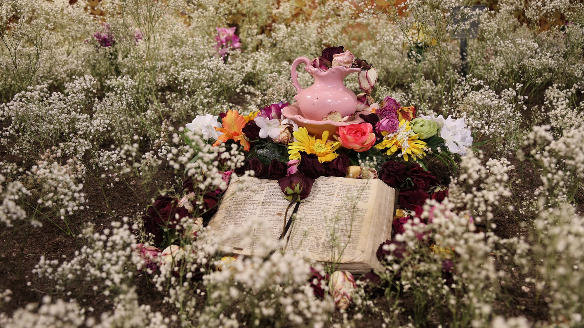 In "The View Inside a Casket" (2020), artist and filmmaker mk finds connections to their late older brother through his headstone and burial site. Centering a photograph of their brother, who passed away just before turning two years old, mk builds outwards with delicately stenciled soil patterns, baby’s breath flowers, and mementos left at the grave. This installation “is an attempt to blur the line between the celebrations of a funeral and what happens to a cemetery once we leave it,” they told me. Here, mk is focusing on the connection to a sibling whom they never met and the family dynamics that spring from loss even when we are not immediately aware of the long-term impact.