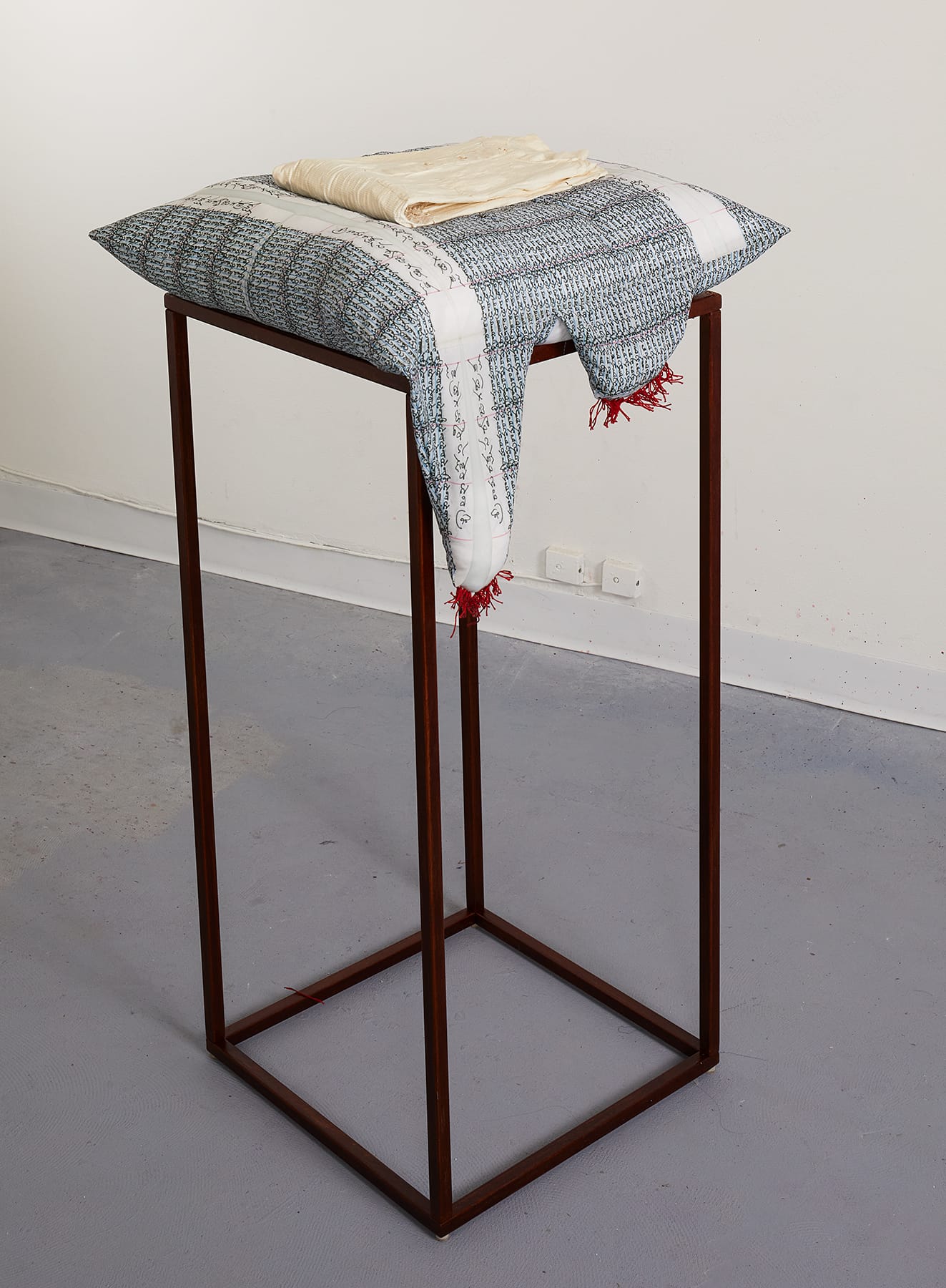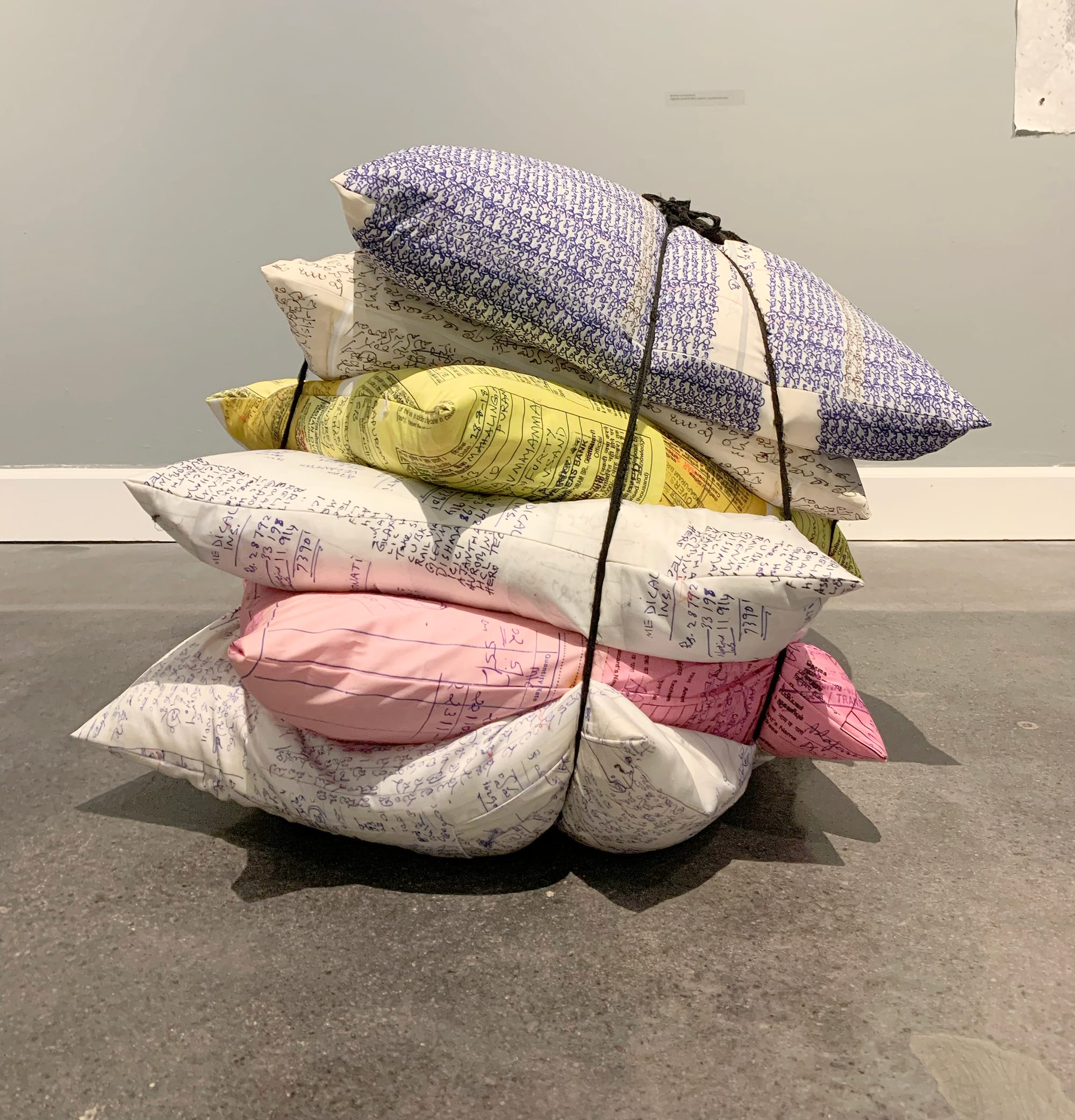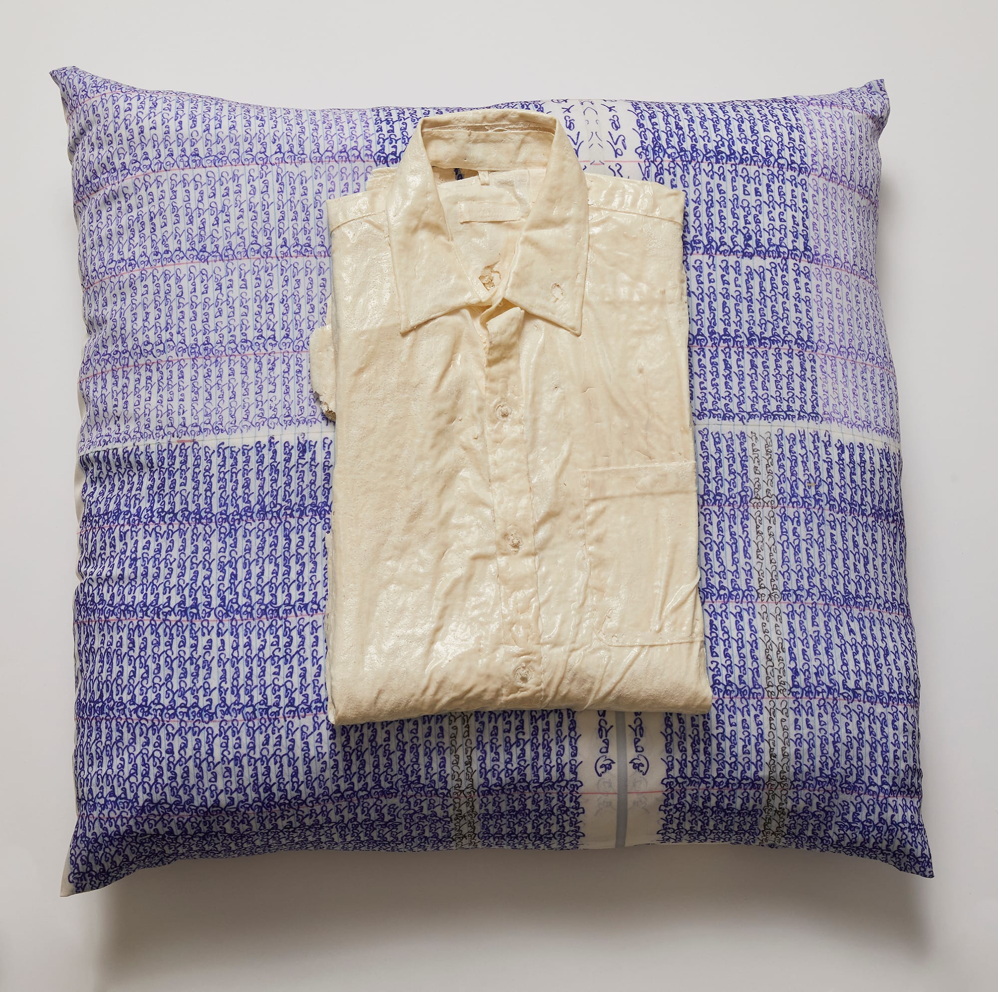 While mk reimagines what we leave with the dead, Nirmal Raja transforms mementos the dead leave behind with us. After her father’s sudden passing in 2020, Raja turned toward her studio as a place of grieving and healing. Mirroring the process of cremation, clothing belonging to her father was dipped in slip, glazed, and fired, thus destroying the original fabric and replacing it with the fragile shell of the ceramic sculpture. Pairing the clothing with her father’s handwriting custom-printed onto pillows, Raja’s series Material Remains became a memory record while also, as she told me, “meditating on transience and exercises in letting go."
