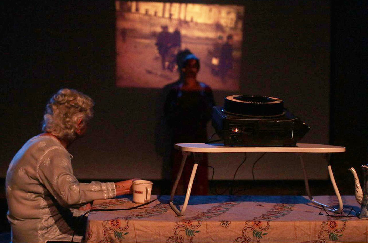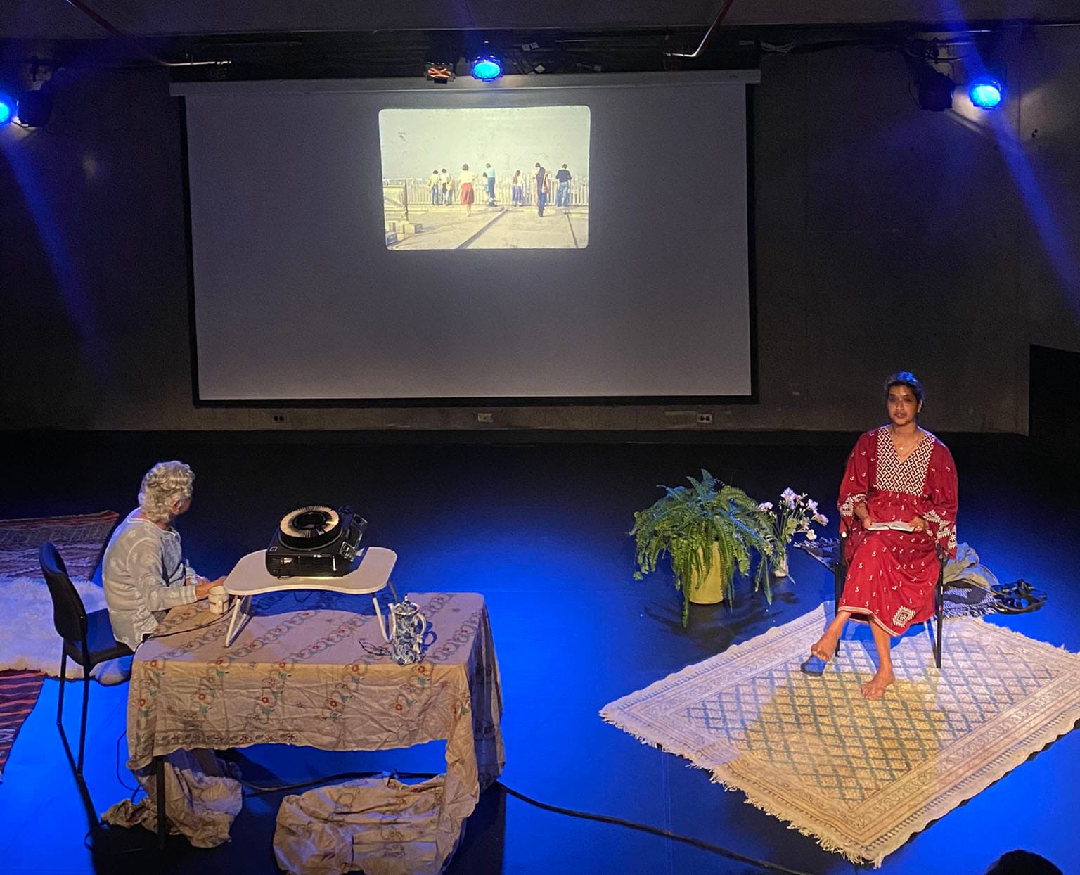 Performed onstage with their mother at the Abrons Arts Center, Sheela Mantri, Resham Mantri’s "Intergenerational Home" projected their late father’s photo slides of family, New York City, and India through the ’70s and ’80s while serving their mother’s chai and inviting audience members to join them in the home setting created onstage. Intergenerational Home is part of an evolving conversation between Resham's art and death practices that asks, as the artist told me, "What if an art practice could help you get through the box of your dead father's gorgeous old photo slides?" Mantri’s work expresses a personal loss while simultaneously forging a community offering of reciprocal healing and support.