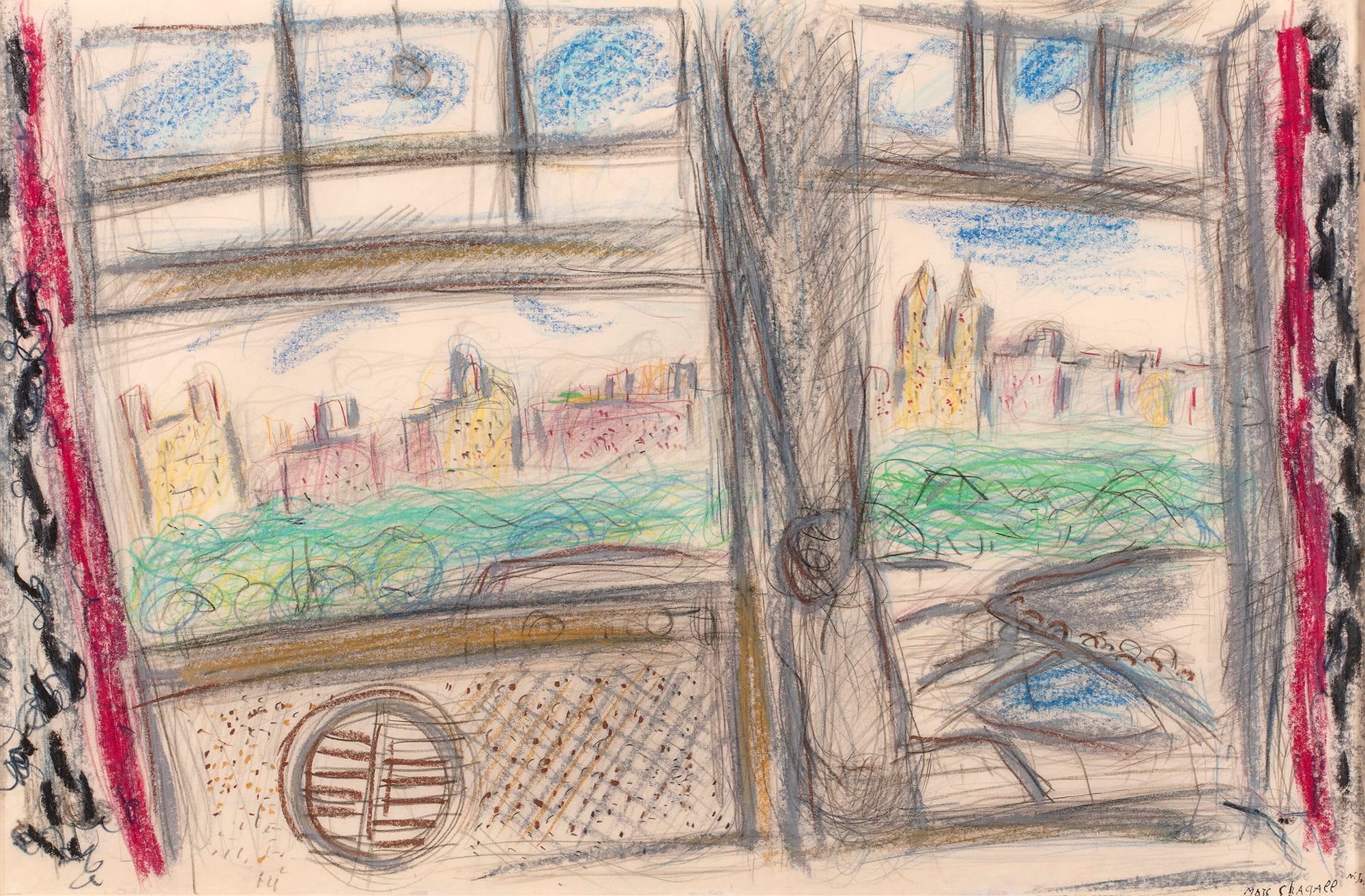 Marc Chagall, "View of Central Park from the Window (Vue de la fenêtre sur Central Park)" (1958), pastel, colored pencils, and black crayon over graphite on Japanese paper (the Solomon R. Guggenheim Foundation / Art Resource, NY, © 2021 Artists Rights Society (ARS) New York / ADAGP, Paris)