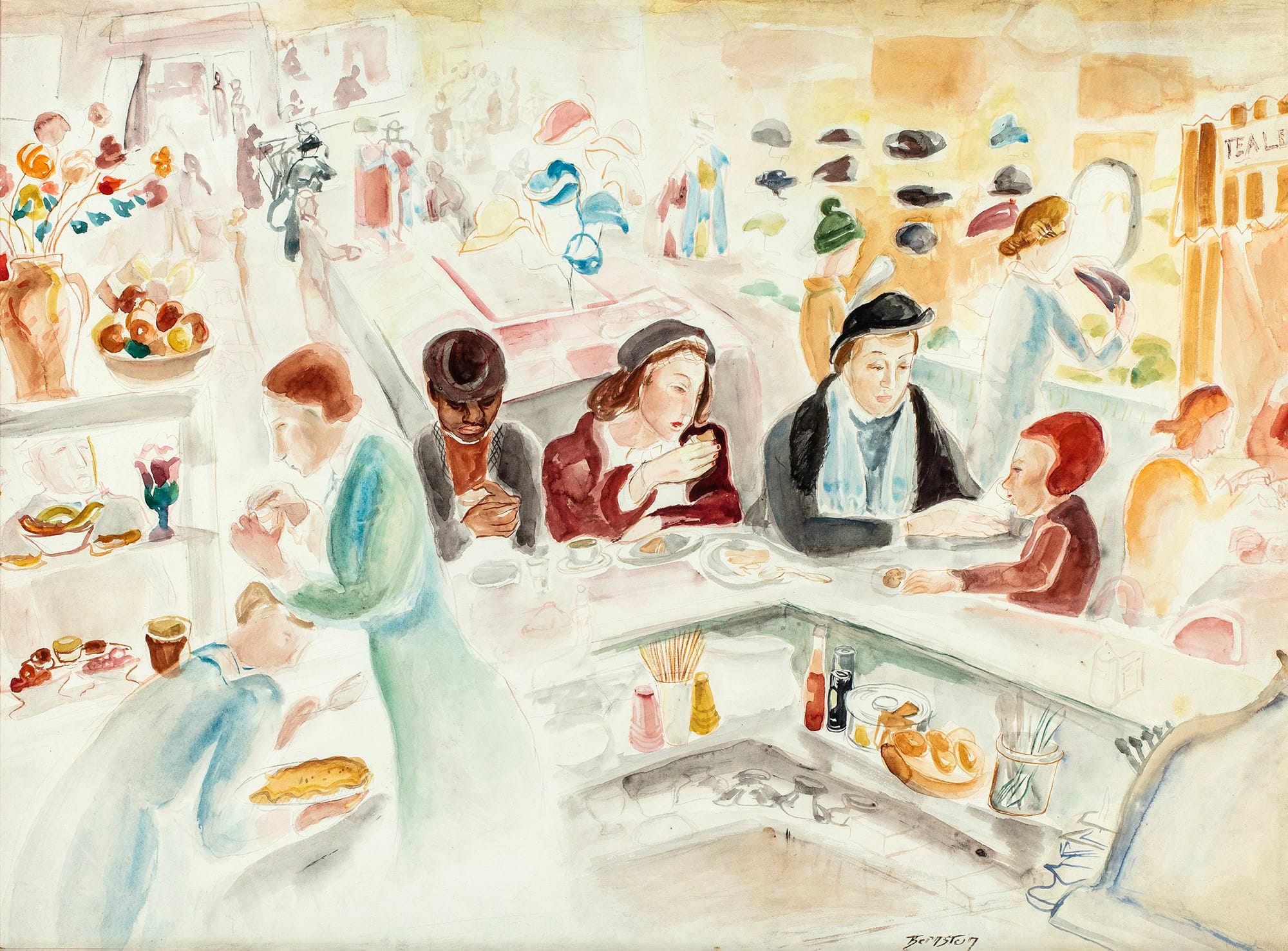Theresa Bernstein, "The Lunch Counter at S. Klein’s in Union Square in the 1930s" (ca. 1930–39), watercolor on paper