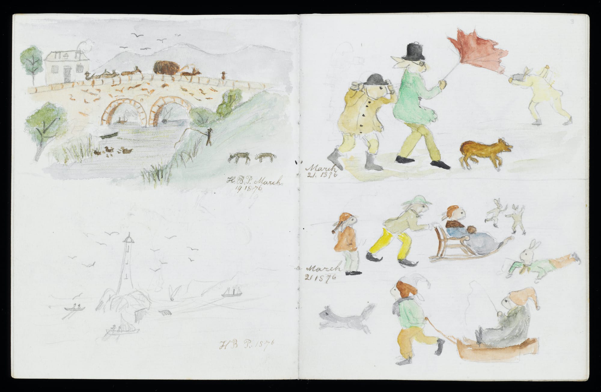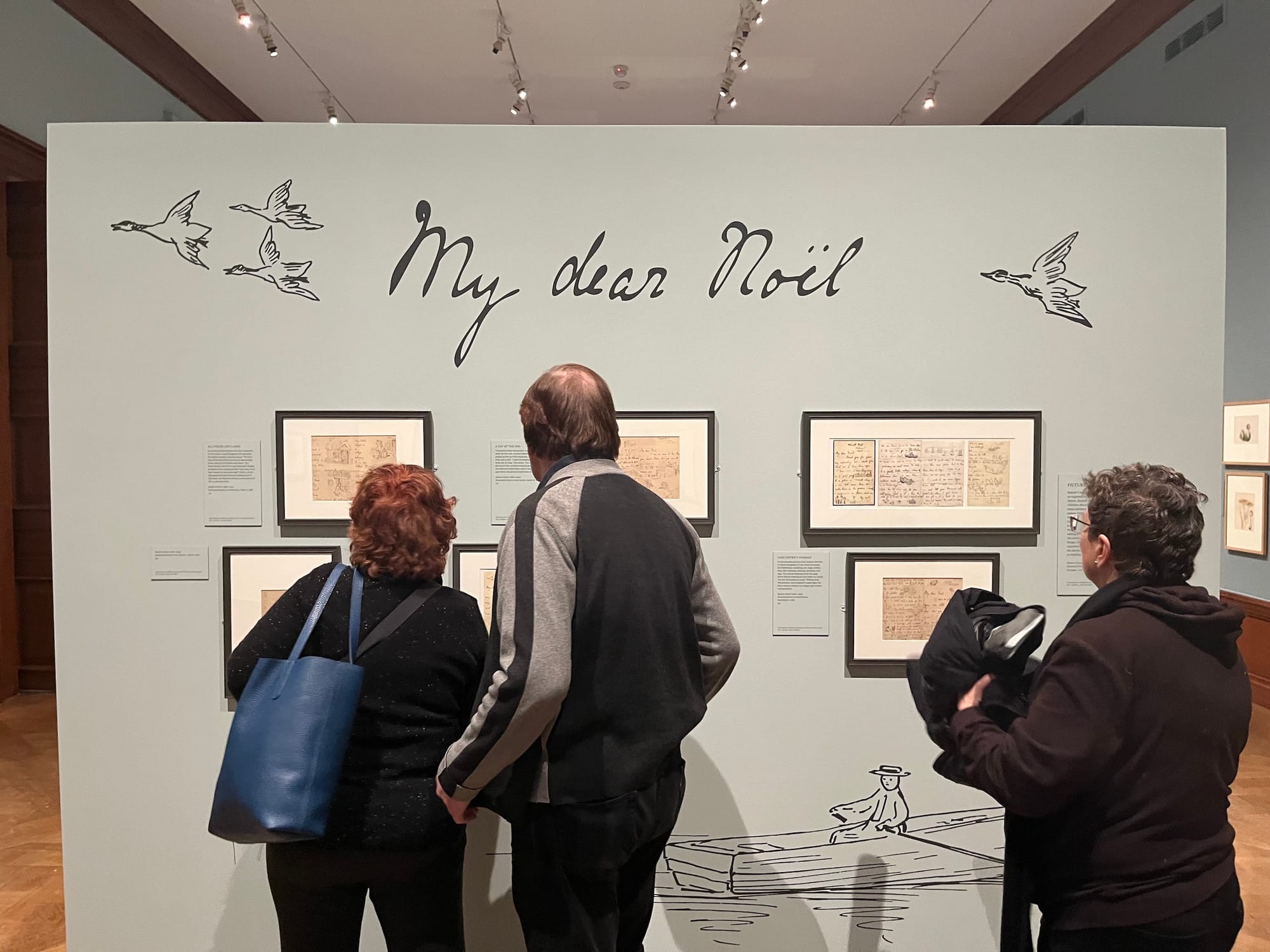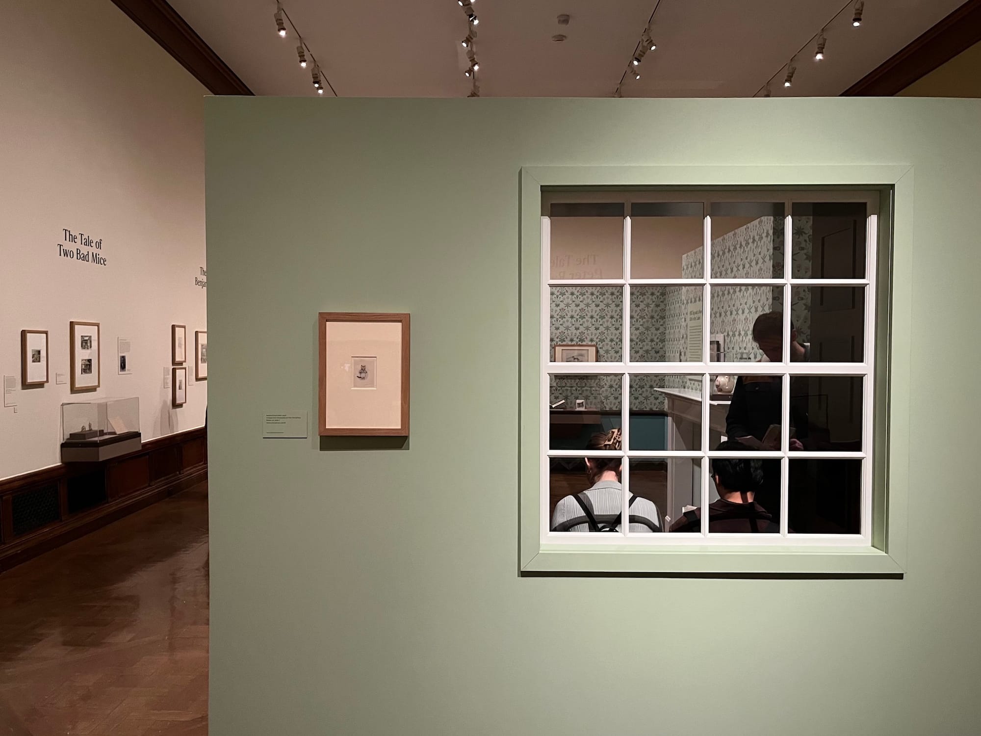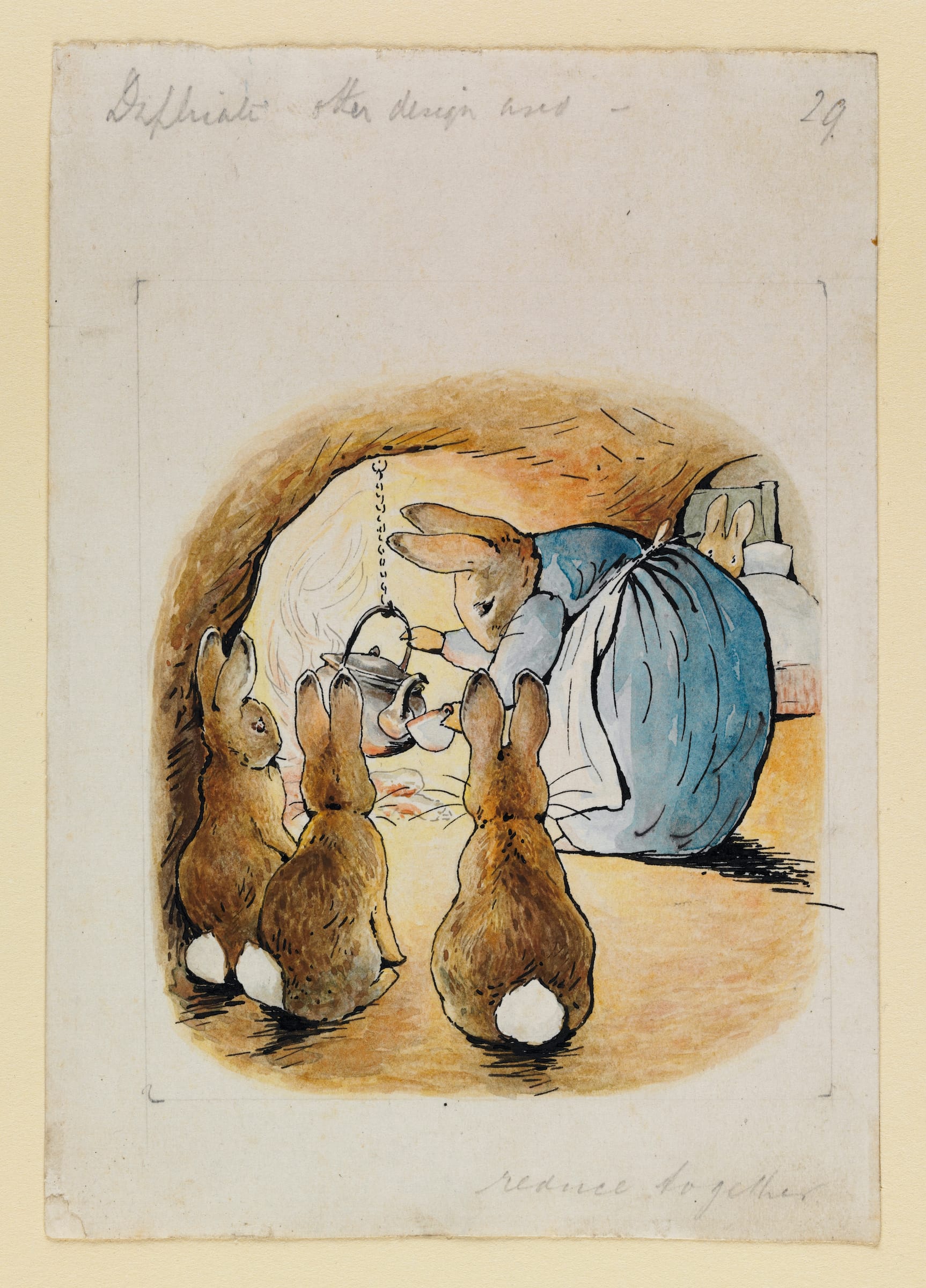 The second portion of the exhibition is dedicated to Potter's 28 children's books, the majority of which were published between 1902 and 1913. Many were based on her correspondences with children, which are displayed alongside finalized illustrations. The show features the eight-page letter to Noel Moore, the son of Potter's former governess, that spawned The Tale of Peter Rabbit (1901). Others include a series of miniature notes written in the voices of Potter characters such as the mischievous Squirrel Nutkin.
