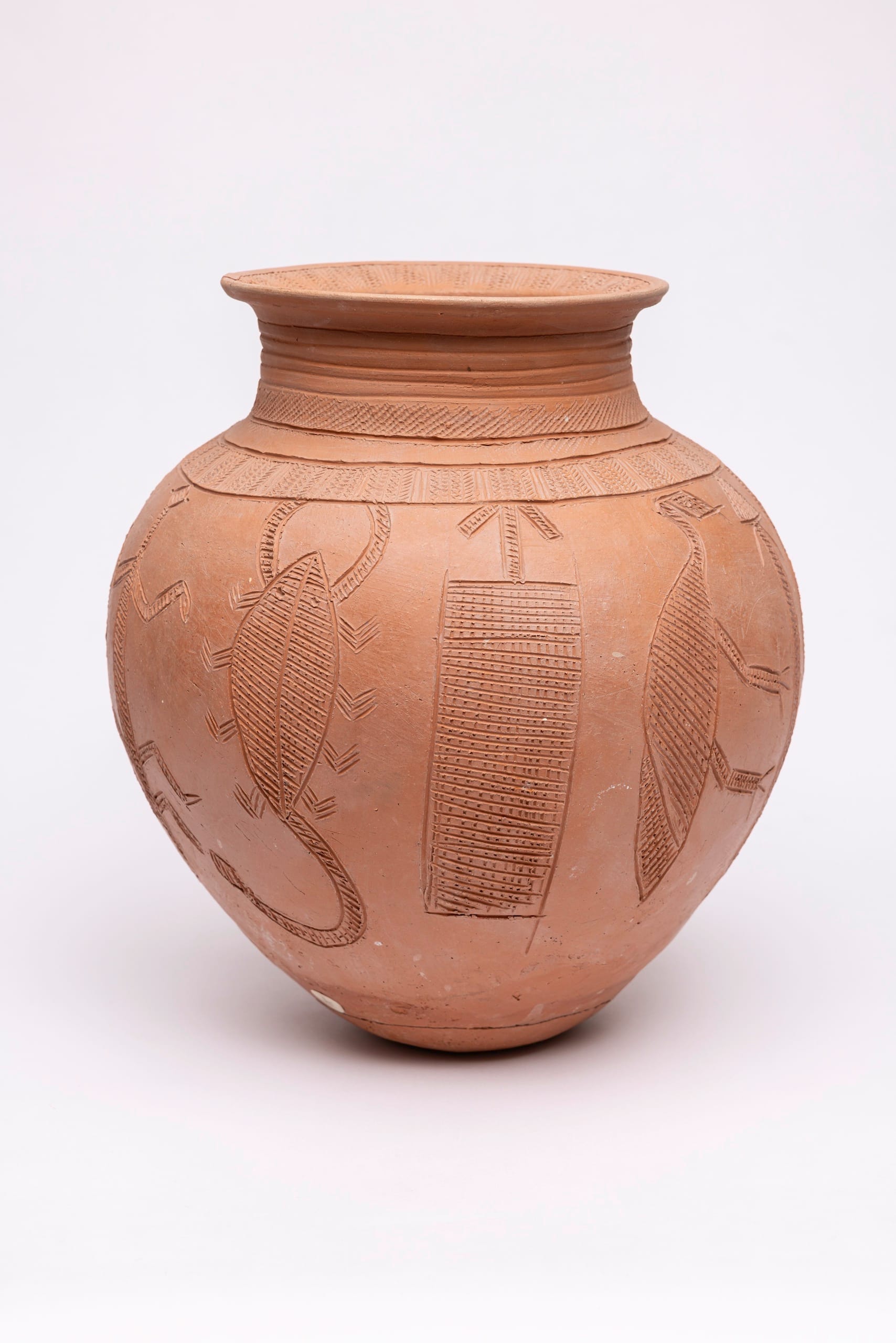Kwali’s unique process emerged from indigenous Gwari pottery techniques she learned in her youth. Later, at the Abuja Pottery Training Centre, she developed them into a distinctive blended style. There, she learned modern studio techniques — decorative glazing, modern kiln firing, and potter’s wheel experimentation — while remaining rooted in the tactile labor of hand-formed clay. As the first woman to study and thrive at the pottery training center, Kwali paved the way for Black women artists around the world to succeed.