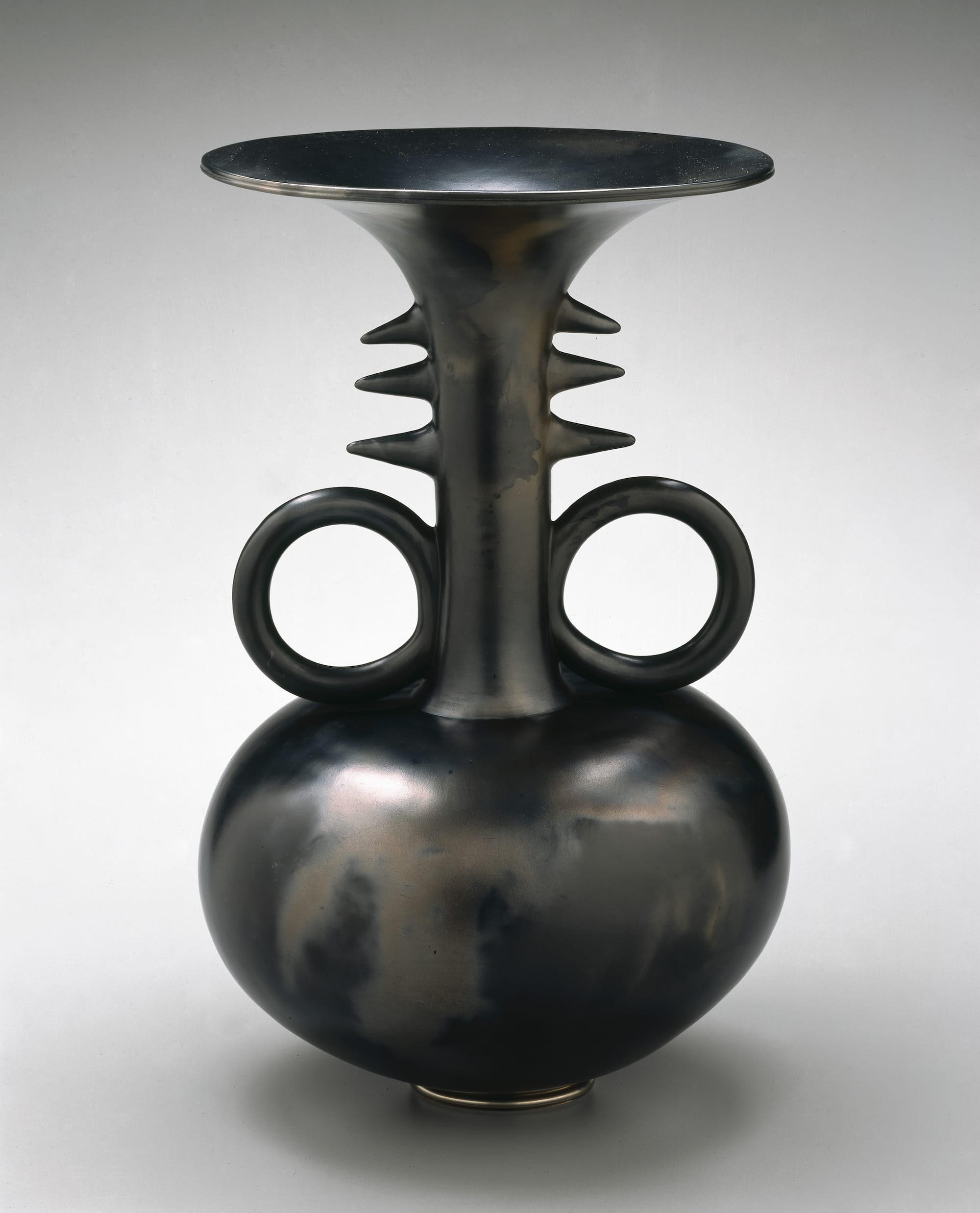 The second half of the exhibition highlights ceramics created by the legatees of Kwali’s influence. Whereas Kwali entered the center as an already accomplished village potter, Halima Audu belonged to a younger generation of trainees. Her jar from 1959, with its dark, glossy glaze and sharply carved geometric patterning, demonstrates how she and others carried local hand-building traditions into a modern studio context. Displayed alongside it, Magdalene Odundo’s 1979 matte surfaced pot, accented with rounded cuts that echo the pot’s contours, integrates this lineage with a new sculptural language. Later works by Odundo, placed at the back of the gallery, showcase her signature tall-necked vessels featuring tilted rims that emphasize their bold silhouette and the play between curve and balance.