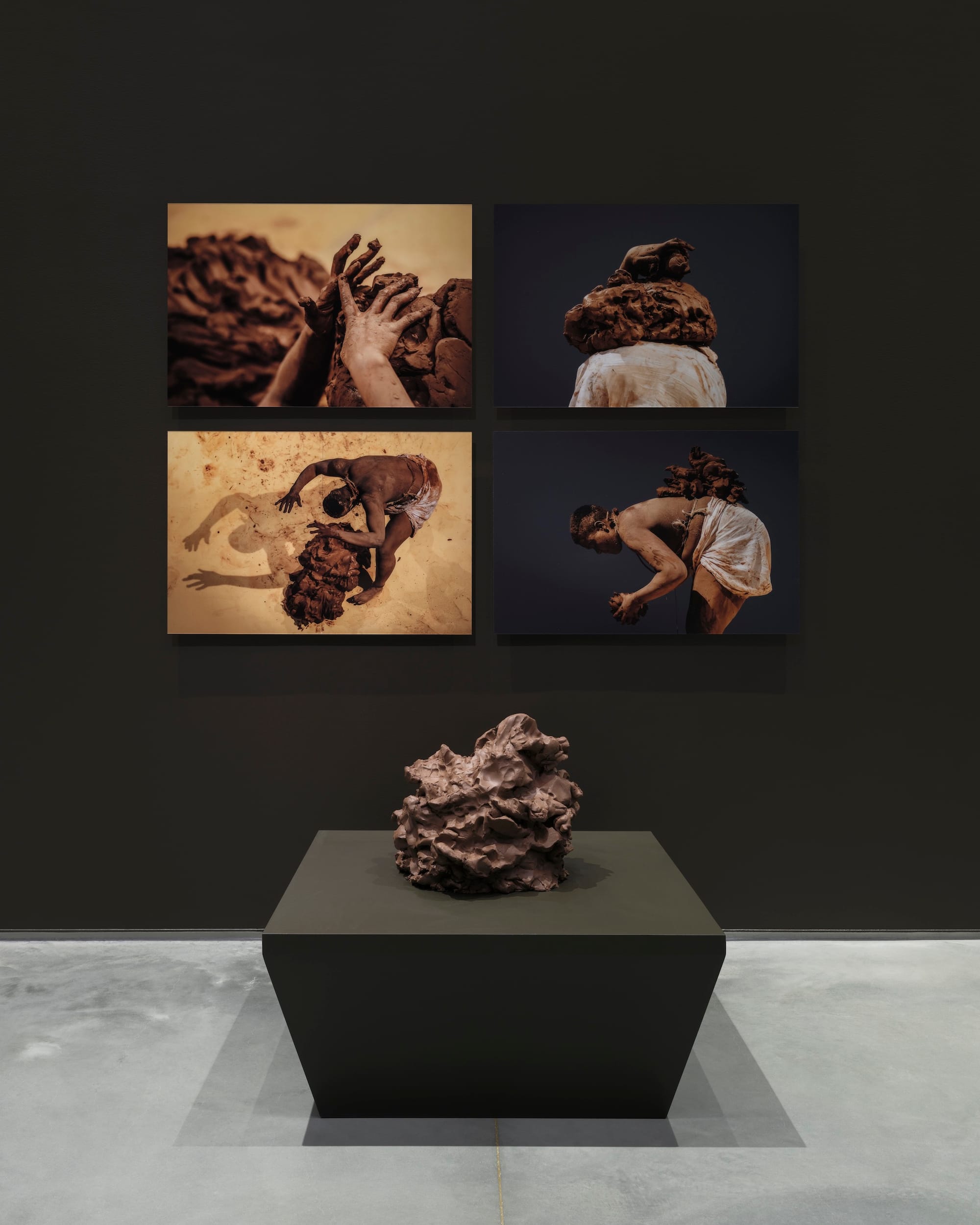 On the floor nearby are works from Phoebe Collings-James’s Infidel series (2025). Known for using clay to confront themes of vulnerability, refusal, and power, she presents tilted, abstracted figures with narrow necks and slanted mouths. Their fragile balance makes them feel both delicate and defiant.