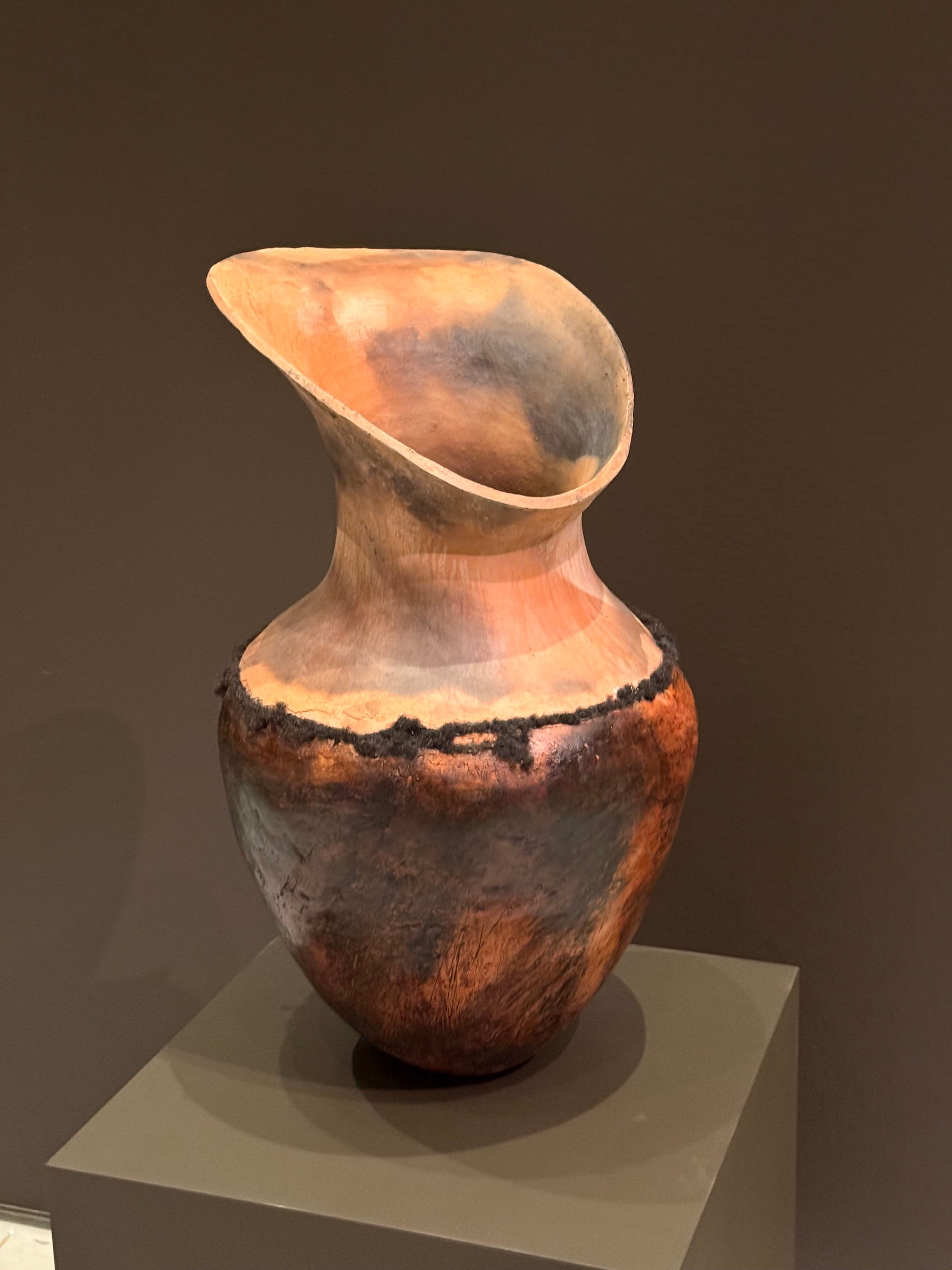 Contemporary artists such as Simone Leigh and Adebunmi Gbadebo follow in this tradition. Leigh cites Kwali and Odundo among the artists who inspire her ongoing practice as a sculptor. In the corner of the gallery, on the floor, sits Leigh’s domed “Village Series” stoneware sculpture (2023–24). The raised, plait-like surface evokes Black women’s braiding traditions, transforming the visual form into a monumental expression. Nearby, Gbadebo’s “Sam” (2023) is shaped from soil gathered at True Blue Plantation in South Carolina — where her maternal ancestors were enslaved — and edged with tufts of Black hair pressed into the pieces. The experimental pot becomes a memorial to land and body, inheritance and loss.