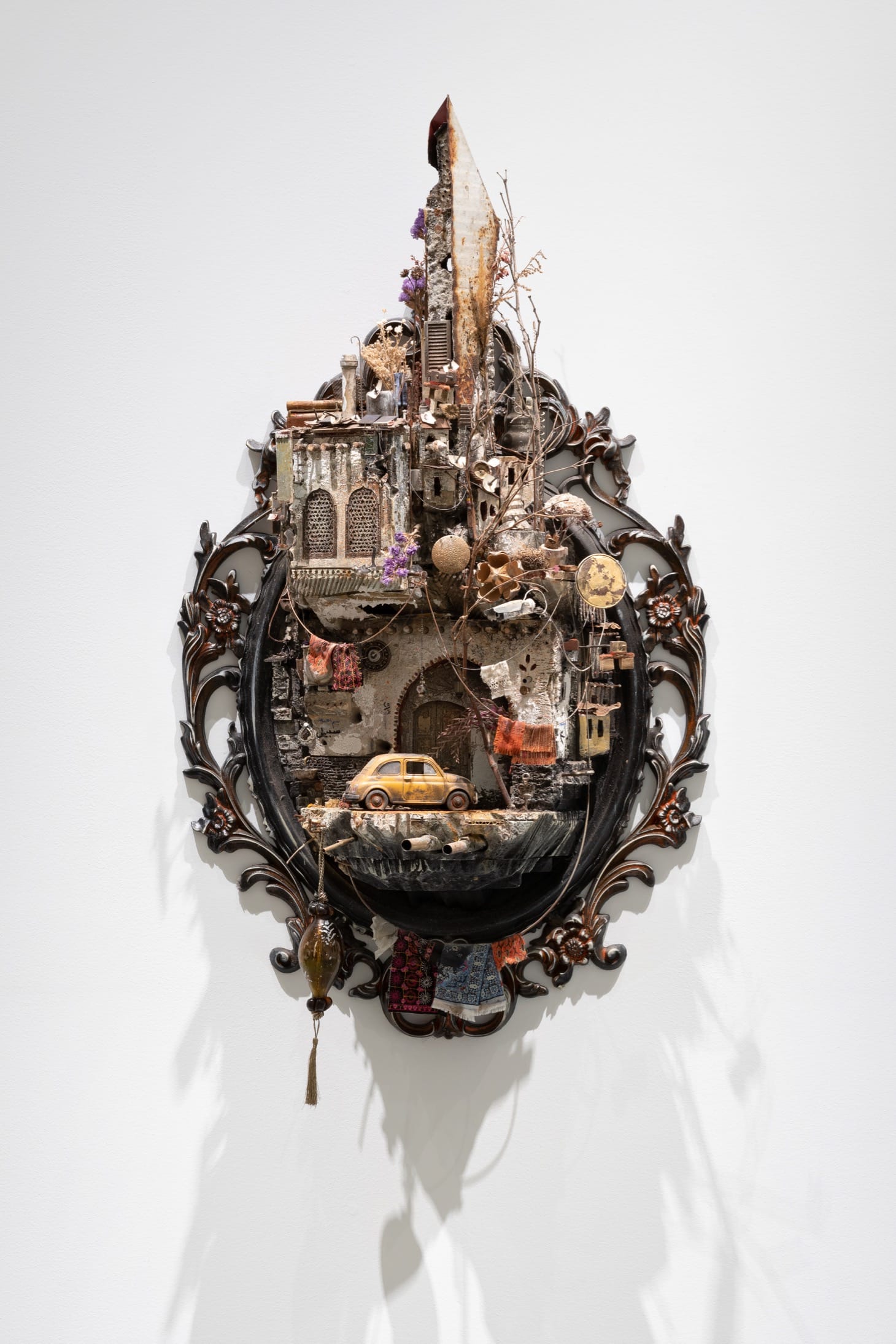As I enter the gallery, I find myself under a curving torrent of bombs that lunge from the back wall into a graceful arc toward me. Mahwish Chisty’s “Hellfire II” (2017–18) consists of cast foam replicas of the eponymous missiles in a show of militarized strength, which hold their fire in a languid cascade of weaponry that for now feels harmless caught in its frozen dive. But this ordinance does eventually come down. I can imagine its effects, but then get to see them backlit in Tiffany Chung’s “finding one’s shadow in the rubble” (2014), a series of light boxes displaying the shelled-out buildings of cities in Syria. Several buildings are still upright, but they are gray, broken warrens, like broken corpses with cratered teeth and no soul alive to be found in their cavities. Right above Chung’s work are two versions of the United States flag, each festooned with the paraphernalia of military personnel — the clips, pouches, insignia, and ammunition belts that regularly stand in for this nation’s might and status in the world. And growing up in this country, the accouterments that signify a kind of florid, overly enthusiastic preparedness for war frequently gets mistaken for actual strength. It isn’t. It’s merely misguided priorities and a show of force that anxiously declares this nation cannot ever die (though, like everything else, it can). While Chung’s work displays the aftermath of this kind of organized violence that aims to control bodies, the next door installation by Mohamed Hafez (a Syrian artist) of miniature dioramas that are magpie concoctions of keepsakes arranged against a large ornate mirror frame contain jewelry, toy cars, dried flowers, tiny window shutters, and satellite dish antennas. They evoke the imagined, mishmash places we construct in our imaginations when we are in exile. Altogether, the work in this front room speaks to the interrelation between the hazards of war and its attraction.