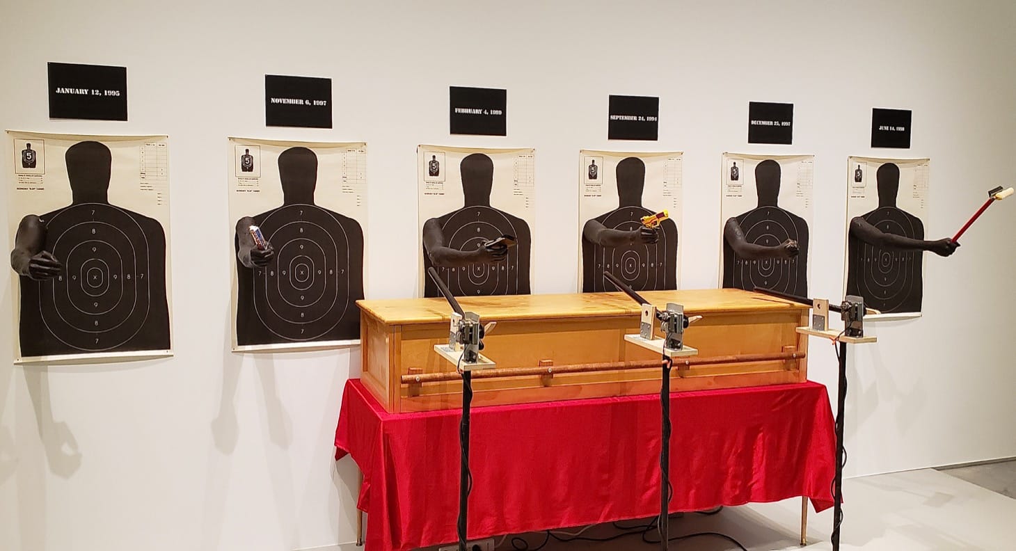 Jasmeen Patheja uses a display of partial personal testimonies generated by a participatory project that has yielded an archive of sexual assault survivors speaking to the particular vulnerability of women’s bodies. The title of her piece, “Meet to Sleep / I Never ‘Ask For It'” (2016-2018), alludes to how blaming the victim for her own violation is another form of denying our own vulnerability. David Antonio Cruz depicts trans women who have been murdered in his “inmysleeplesssolitudetonight, portrait of the florida girls” (2019) in slightly hazy, but brightly colored paintings of his subjects — as if to memorialize the varied chromatic palette of their lives that Cruz will not allow to be dimmed in death. Dread Scott’s “The Blue Wall of Violence” (1999) is a similar kind of elegy to Black men murdered by police, though here the bodies are reduced to gun range targets holding various items in their attached cast arms. The piece recognizes that it doesn’t matter what they hold in their hands: keys, a wallet, a candy bar, a phone, or nothing at all. They are subject to violence because of who they are (much like the trans women), not because of anything they have done or could do. Nona Faustine’s “Demeter’s Morning” (2019) shows that we are vulnerable not merely to bodily injury and death, but also to the circumstances of being persistently precarious by living without a stable shelter. These are all very moving and insightful works, but the other pieces in the room make the exhibition feel diffuse, almost rambling.