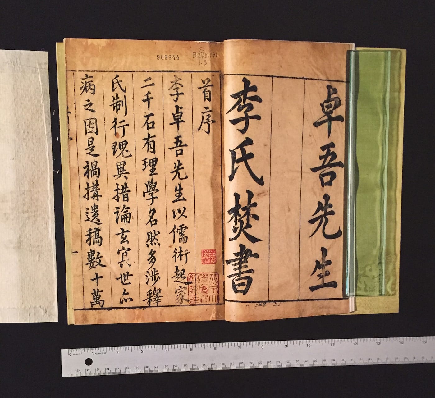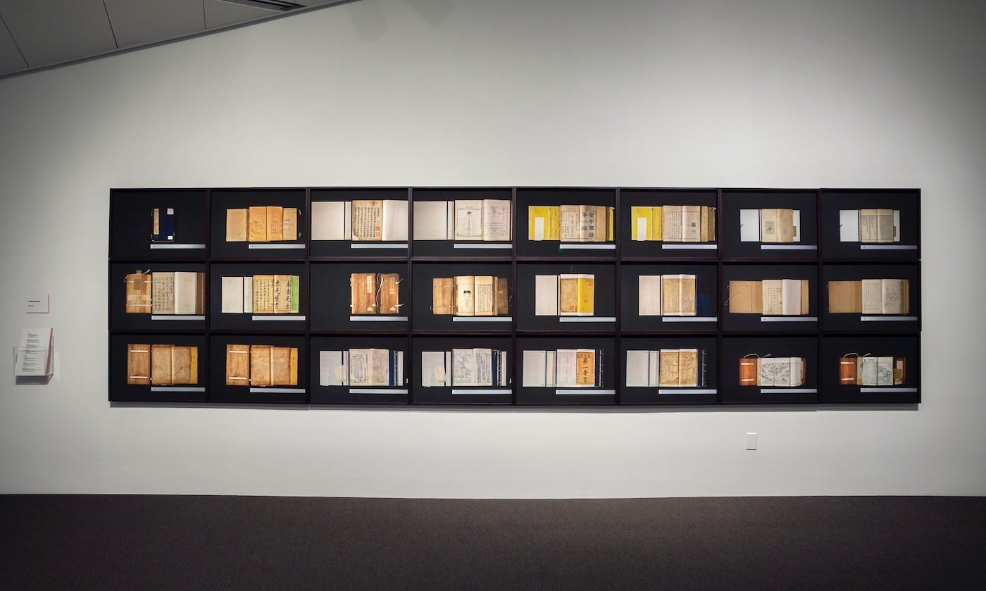 Eyes On: Xiaoze Xie is accomplished in three parts: a display of modern books, ancient books, and the screening of a documentary. Starting in 2012 the artist collected over 500 banned books, and “Objects of Evidence (Modern Books)” includes 293 of those volumes. The long display table is organized by books banned by the Nationalist Party of China during the era of the Republic (1911-1949), the 1950s, the Cultural Revolution (1966-1976), and from 1980 to 2010. The top shelf of the display case has stacks of first editions. The books published during the Cultural Revolution, include hand-copied volumes, commonly called yellow cover or gray cover books, Western literature, and books by authors who did not conform to the party’s politics, and thus were labeled “poisonous weeds.” Below that glass shelf another display of books echoes the ones above or fill in its gaps with second editions. These editions were printed outside or inside China after the prohibition was lifted. By finding first editions and second editions for comparison, Xie could isolate a single sentence that was removed or find the causes for censure.