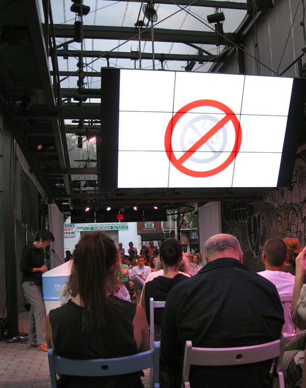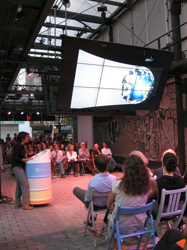 Despite my reservations, when my friend emailed me last week to attend one of the lectures I decided I would hear what the Lab had to say. I did appreciate that the Guggenheim built an unassuming makeshift space to house the Lab that at least in its physical design promotes an inclusive and welcoming atmosphere. Located in a small park on Houston Street and Second Avenue and designed by the Japanese architecture firm Atelier Bow-Wow, the minimal structure gets almost lost among the booming high-rises in the East Village. Walking up to it I thought, “Wait, is this it?” The pavilion is open on either end and includes an exposed rigging system on the ceiling used to drop down LED screens and other technology tools during events. The space feels organic, as if it has sprung out of the sidewalk itself, which suites the Guggenheim’s mission to involve the community as much as possible and bring the discussion of urban living down to street-level.