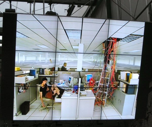 In “Facismile,” a 16’ high by 27’ wide video screen is attached to the façade of Moscone Convention Center in San Francisco. The screen travels across the building while broadcasting a series of animated vignettes. The scenes are quirky and humorous (the shot shown above got several laughs from the audience), showing everything from disheveled office spaces to businessmen undressing in their hotel rooms. Diller described the apparatus as a “magnifying lens” or “periscope” that deceives the viewer into thinking they are seeing the action inside of the Convention Center. I loved this idea of the screen scanning the building as if to make an exact copy of it but instead producing something that is so obviously skewed. The project shows that even though our world is supremely visual, images don’t always guarantee more transparency.