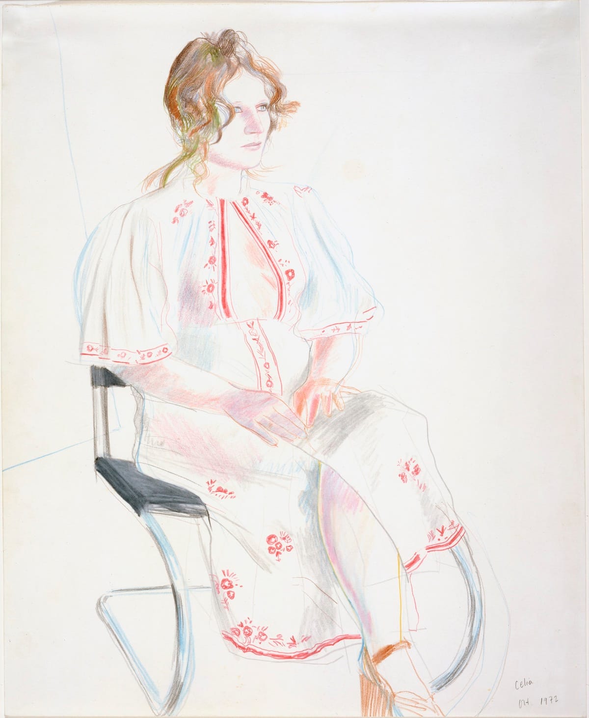 On the notion of muses, Hockney/Origins also includes six vastly different and emotive full-figured portraits of the artist's close friend, fashion designer Celia Birtwell, who sat for the artist multiple times. Hockney also defects from figuration in "Panama Hat" (1972), a combination of portraiture and still life capturing the essence of friend and curator Henry Geldzahler through signature accessories as stand-ins for his physical form. The stripes of the jacket radiate with tangible life in a striking image of crisp edges and high contrast.