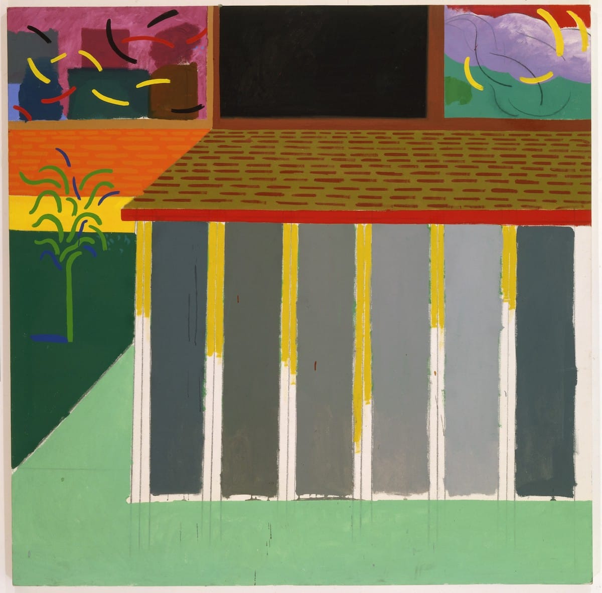 Additional highlights of the show include Hockney's painterly representations of modern architecture in "Japanese House and Tree" (1978) and "French Shop" (1971). The former, Karasoulas notes, exemplifies Henri Matisse's influence on the artist in terms of the curvilinear "cut-out" forms strewn across the composition, as well as the exuberant color palette and painterly hand.