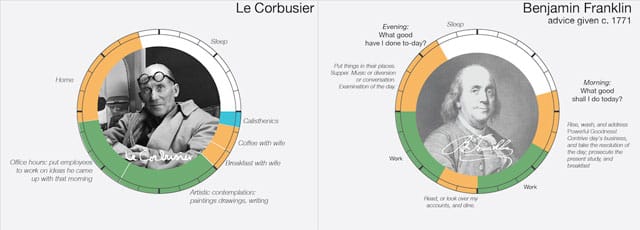 It may take us years, even decades, to get our routines right (and they’re subject to change), so in the meantime we look for guidance. Plus, the question of how our creative forebears organized their time makes for fascinating fodder. This is the subject of Mason Currey‘s 2013 book Daily Rituals: How Artists Work, which RJ Andrews, of Info We Trust, has now mined to create data visualizations of the daily routines of a number of historic creative figures.