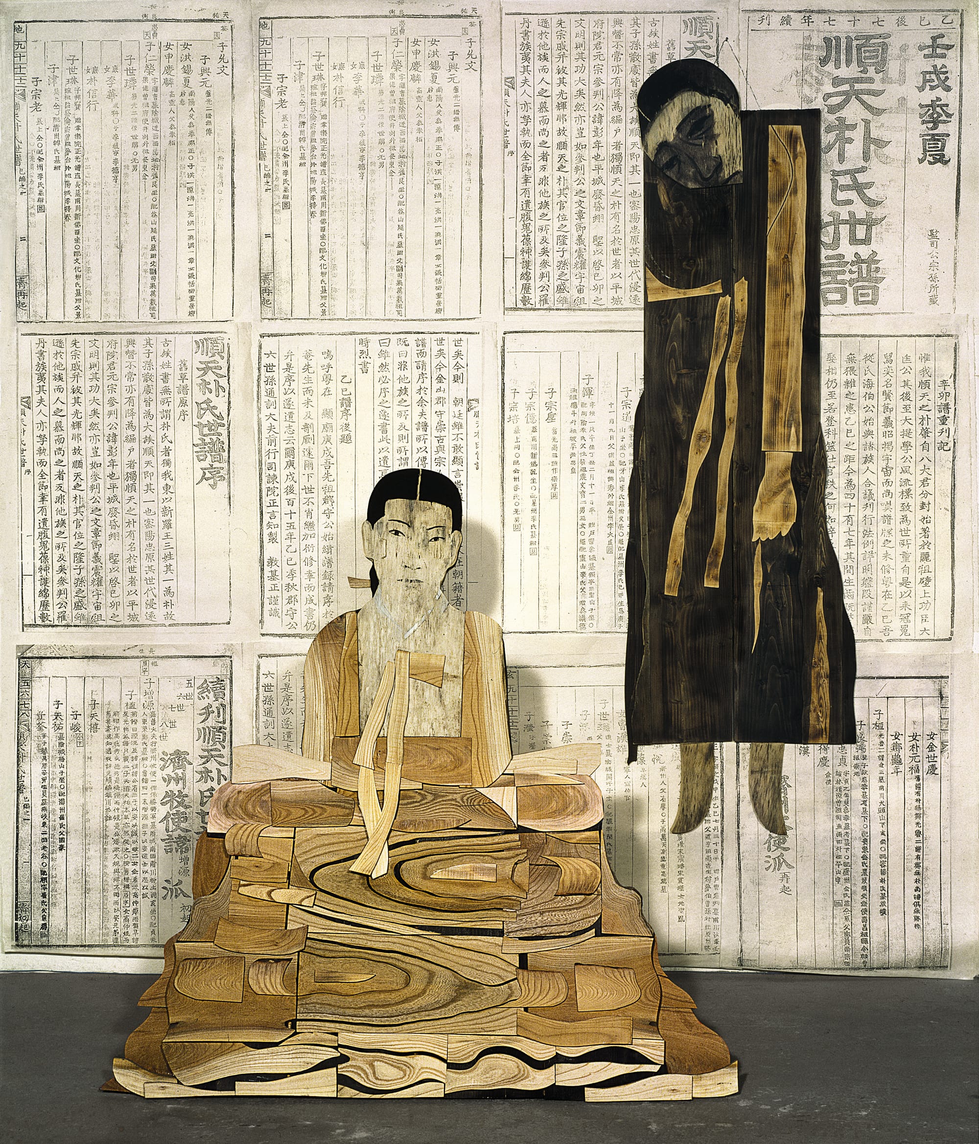 The chapter on the North American diaspora also has strong political undertones, highlighting the work of the late artists Theresa Hak Kyung Cha and Yong Soon Min, as well as Jin-me Yoon, who all emigrated as children. Kim borrows Homi K. Bhabha’s phrase “the genealogy of that lonely figure” to describe the displacement inherent in migrant communities as a direct effect of globalization. She discusses, for instance, Min’s series Defining Moments (1992), which includes six self-portraits that overlap with words and numbers, representing historical links to her identity, including the 1960 student uprising, the 1980 Gwangju Uprising, and the 1992 Los Angeles Riots. These artists also consider the displaced body of an Asian woman as a site of erasure, violence, and instability, acknowledging the unfilled desire to return to a unified Korea or feel a sense of belonging in America.