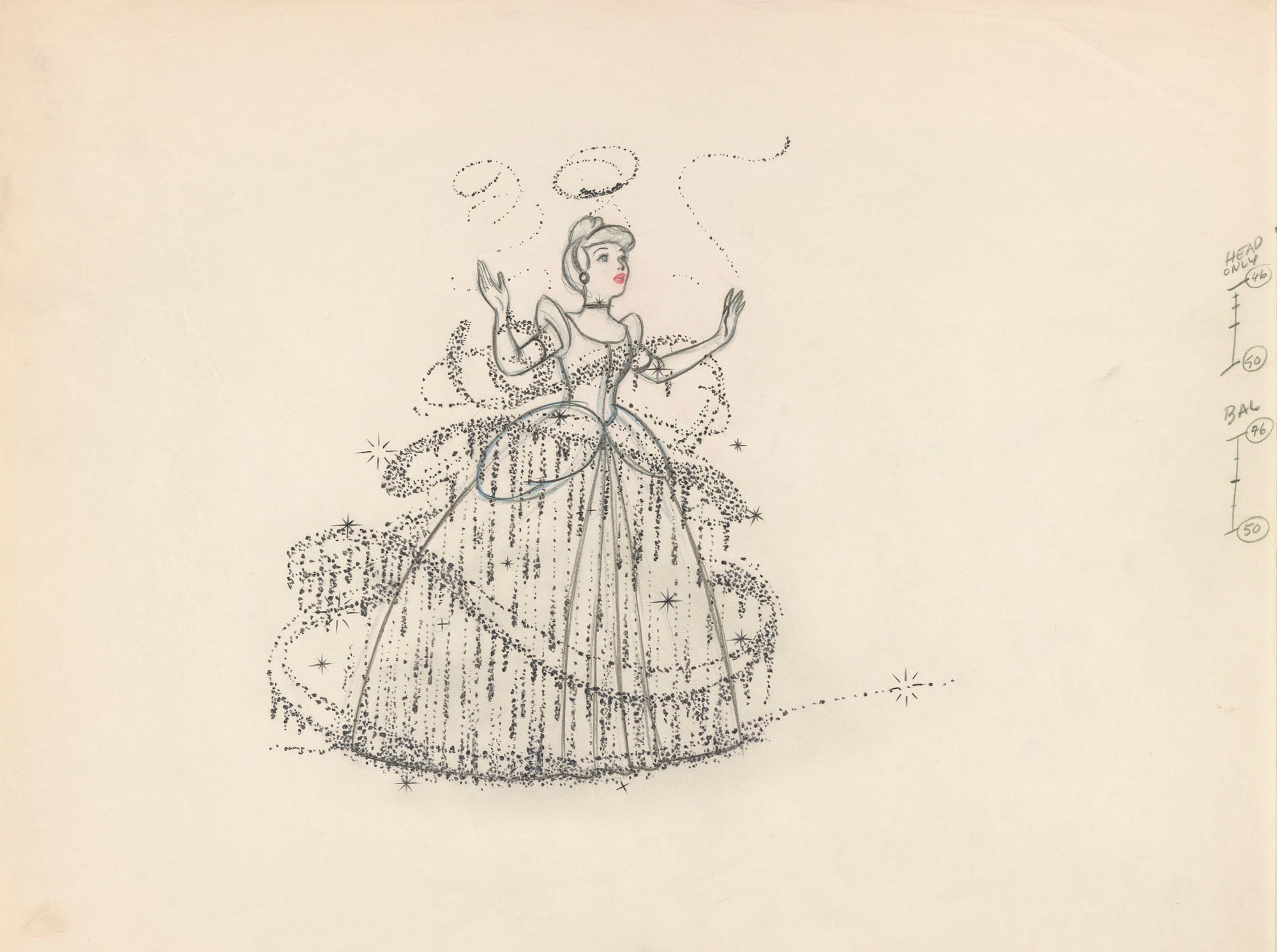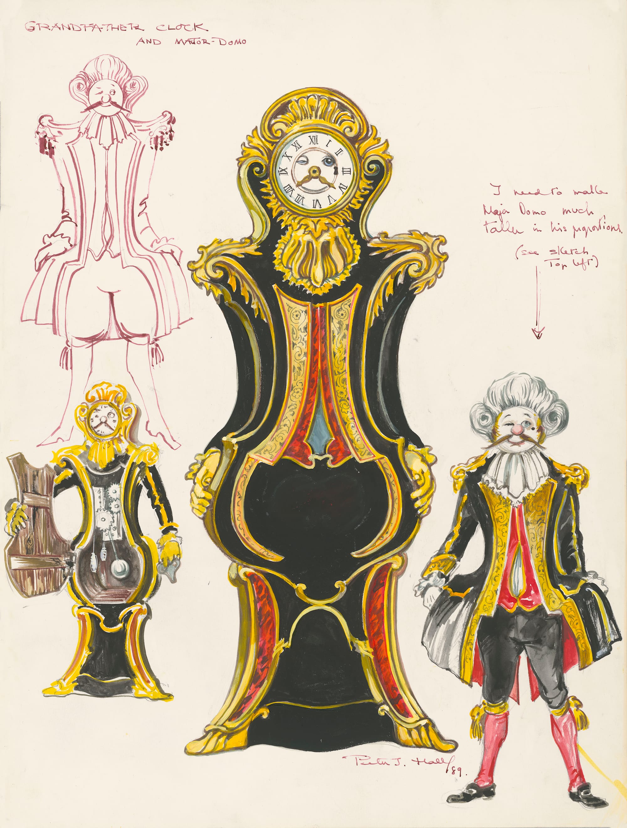 Indeed, so familiar are the animated feature films — specifically 1950’s Cinderella and 1991’s Beauty and the Beast — that encountering these popular culture items within the wider context of art history rather than the historical vacuum of our personal memories is likely to have a huge psychological impact. This realization occurs repeatedly throughout the show, as we are treated to visual origin stories in which rough drafts of characters are nearly, but not quite, the final form we know so well; the tantalizing effect is like witnessing a song being written in real time. For the watercolor concept designs for Cogsworth, animator Peter J. Hall channeled Parisian clocks from c. 1690 to 1720. Handily such a clock from the Wallace collection is positioned nearby, illustrating the commonality in form and style. It is a long-case upright box, decorated with gilding and Boulle marquetry, and the curators are at pains to highlight the shared anthropomorphic tendencies of both items — the clock face sits atop a “body” delineated almost as if wearing a uniform complete with yellow-gold trimming. It takes little effort to imagine an uppity, starched pomposity were either to come to life.