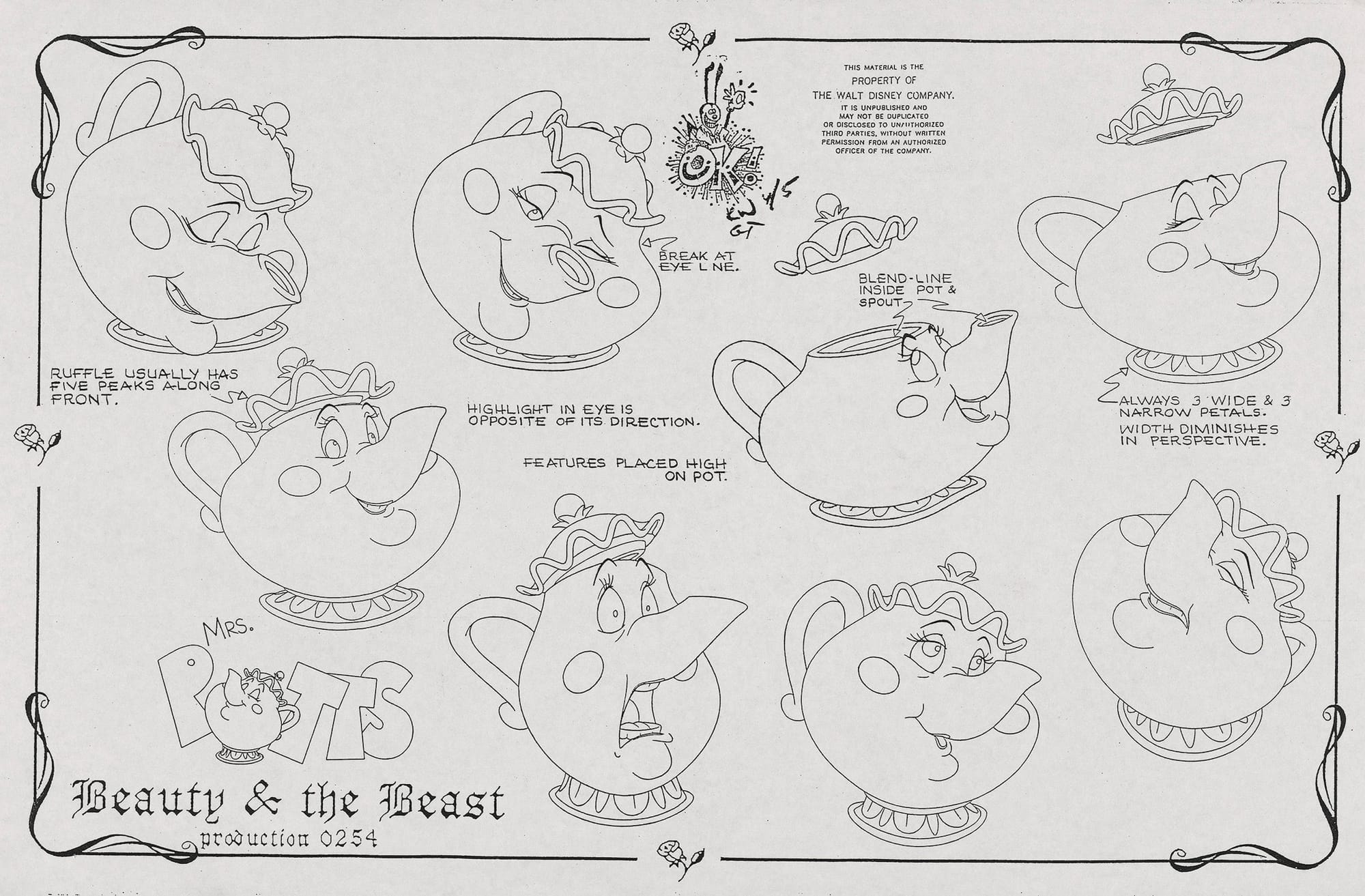 We are also shown how Disney animators adapted French interior design for scene setting. A child may not immediately associate the ballroom in Beauty and the Beast with Versailles, yet designs by Michael Hodgson directly modeled on its spectacular Hall of Mirrors show how forehead-slappingly obvious is the connection. Especially fascinating is the joyous freedom the animators were given in this adaptation; a pencil design layout by Ed Ghertner for the Beast’s library is a technically incorrect mash-up of several conflicting perspectives, nudging it into the whimsical fairytale realm. A bit like Piranesi cranking his architectural drawings beyond realism, such bending of strict perspectival rules is a gateway to the fantastical.