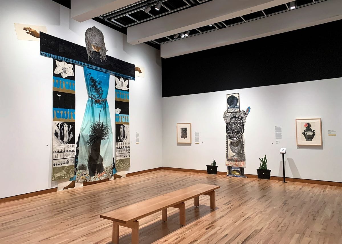 Wilson, who lives in the small town of Carrizozo, New Mexico, presents artwork that feels deeply personal and centers women’s bodies as “places” of observation, inhabitation, and projection. In “Yucca Rising” (2021), the body does not exist within the landscape but becomes a part of it. At more than 15-feet tall, the figure rises well above other artworks in the room, its bowed head placed strategically between ceiling support beams. Combining varietal painting and printmaking techniques and media on muslin, the figure’s dress, adorned with patterns of yucca plants, seedpods, and flowers surrounding a central image of a large blooming yucca plant in front of a darkening sky, literally embodies the landscape.