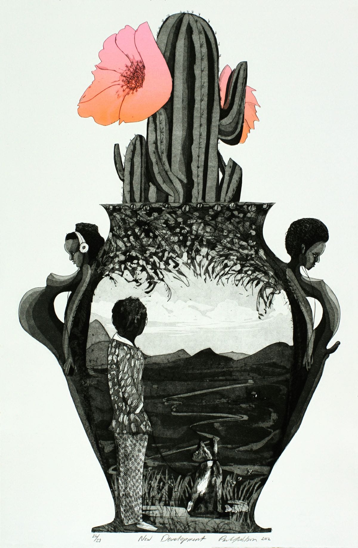 In “New Development” (2012), Wilson presents an image of an amphora holding a blooming cactus. The handles of the vessel are formed by figures of a pregnant woman and a man with an erect penis. Each figure wears headphones, anchoring them in contemporary times, though their nude bodies are timeless. On the body of the vase is an image of a landscape. A modern figure in a patterned outfit stands, with a dog, gazing from precipice across the path of a winding river that cuts through plains and disappears into distant hills. The imagery is highly suggestive of fecundity. Nicola López was born in Santa Fe, New Mexico, and now lives and works in Brooklyn. Her mixed-media works engage printmaking and photographic processes to present speculative landscapes, interrupted by the collapsing skeletons of imagined industrial structures. Printed as collagraphs over photographs of White Sands National Park, the images are reminiscent of the infrastructure scenes of the late Massachusetts-based painter and printmaker Donald Stoltenberg who specialized in collagraph.