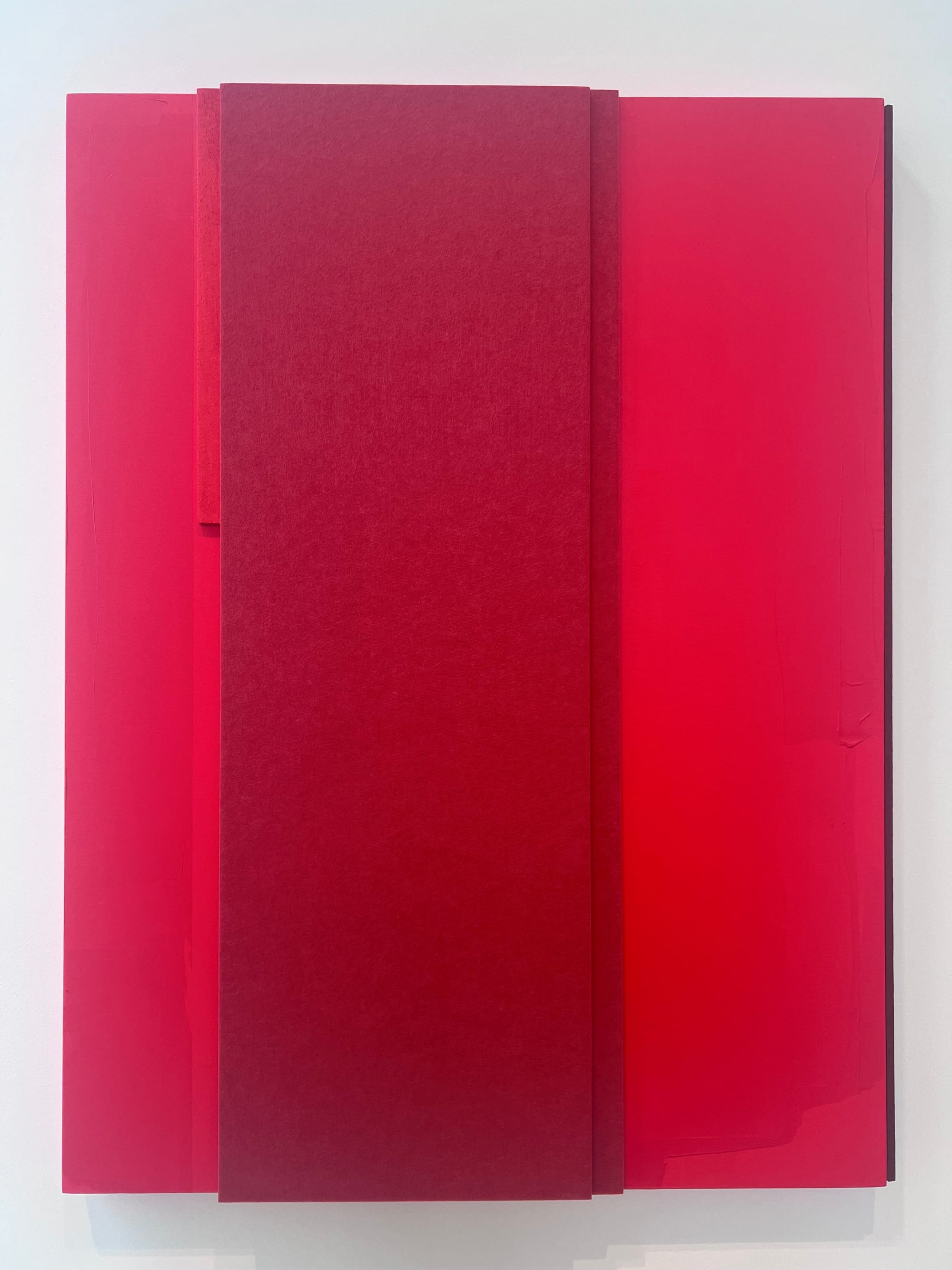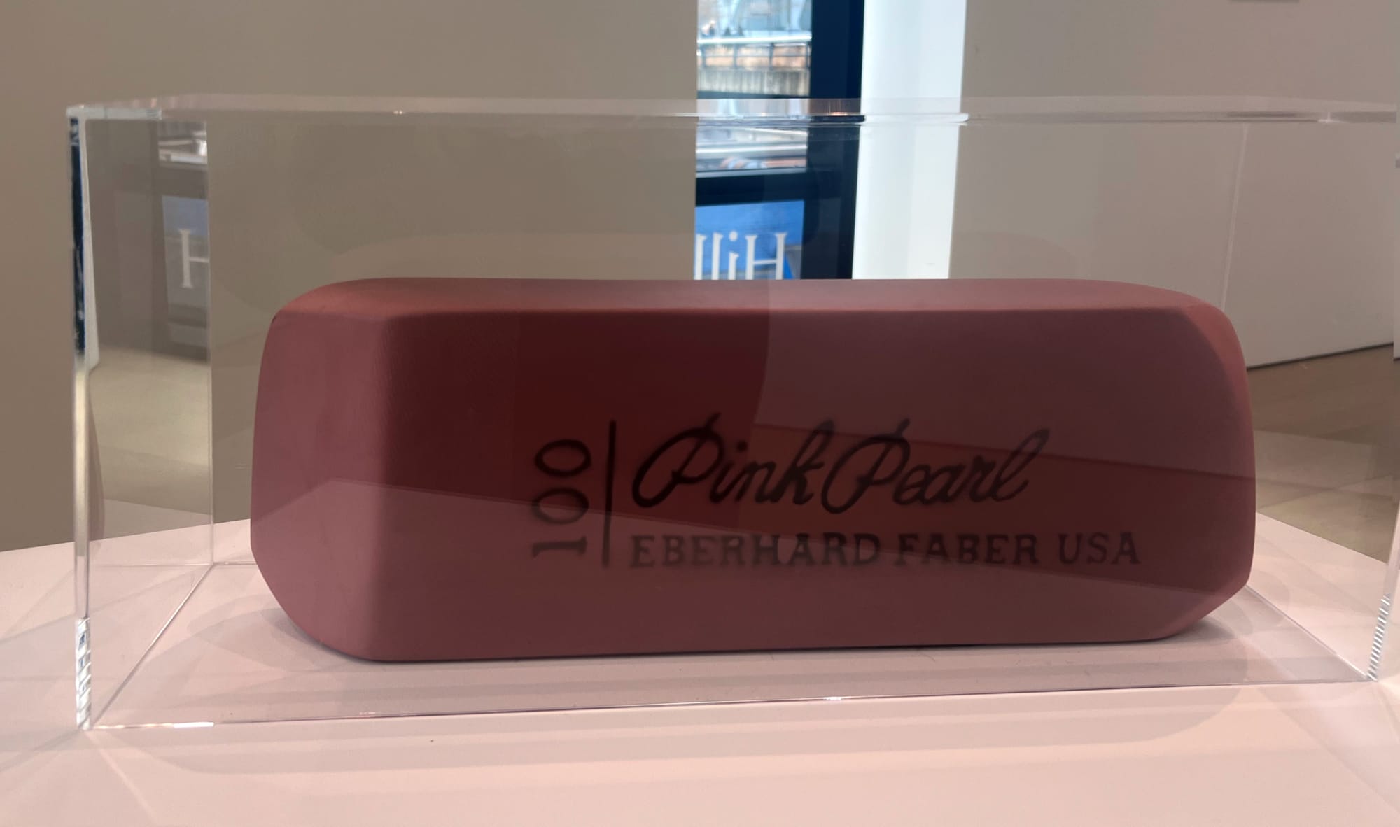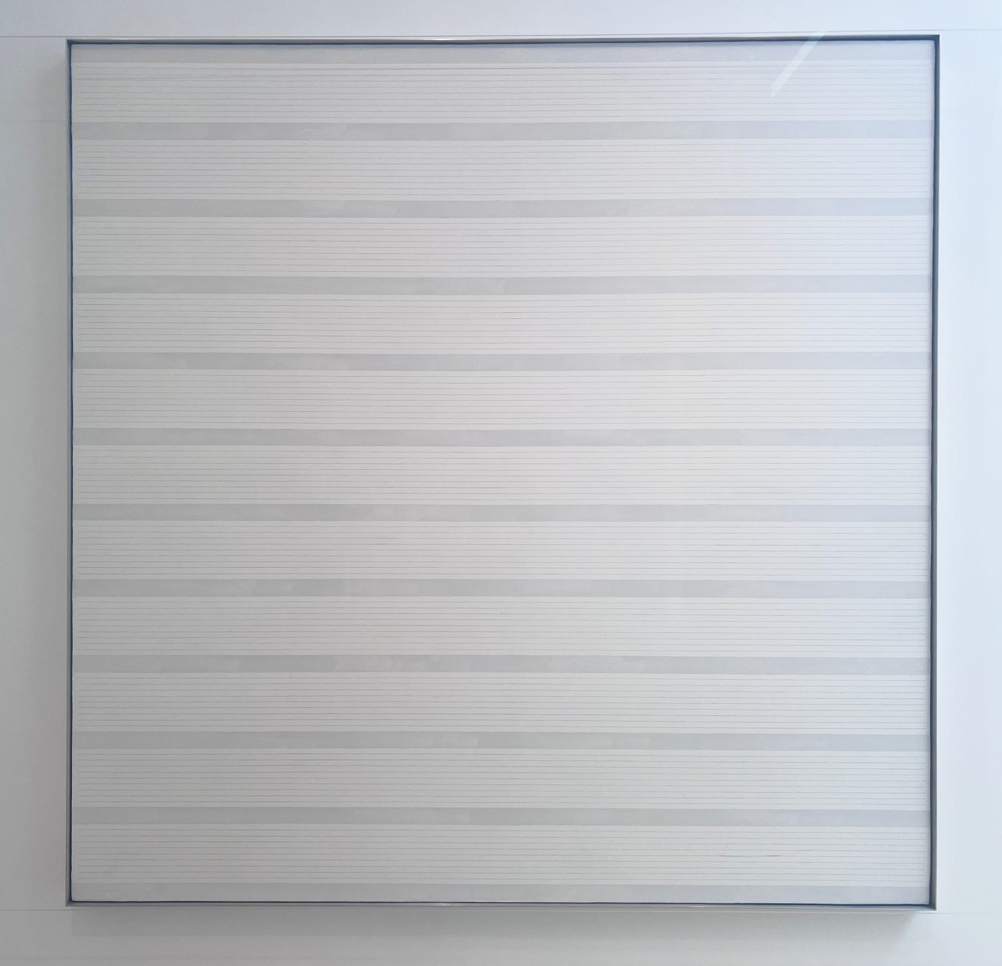 Equally integral to the exhibition, as suggested by its subtitle, is silence. Works related to the theme range from the cutesy, such as Vija Celmin’s “Pink Pearl Eraser” (1966–67), a large-scale reproduction of the eraser (though she’s capable of inducing a deep form of quiet), to those that hush the mind, as in two works by the queen of silence, Agnes Martin. “Untitled #20” (1988) evokes a lined page or a music staff absent its notes, but possesses a formal completeness that forestalls the dread of trying to fill it. “Untitled 20” and an architectural relief panel by Jennie C. Jones, “Fluid Red Tone (in the break)” (2022), most successfully achieve one of the exhibition’s stated aims — “show[ing] what silence looks like.”