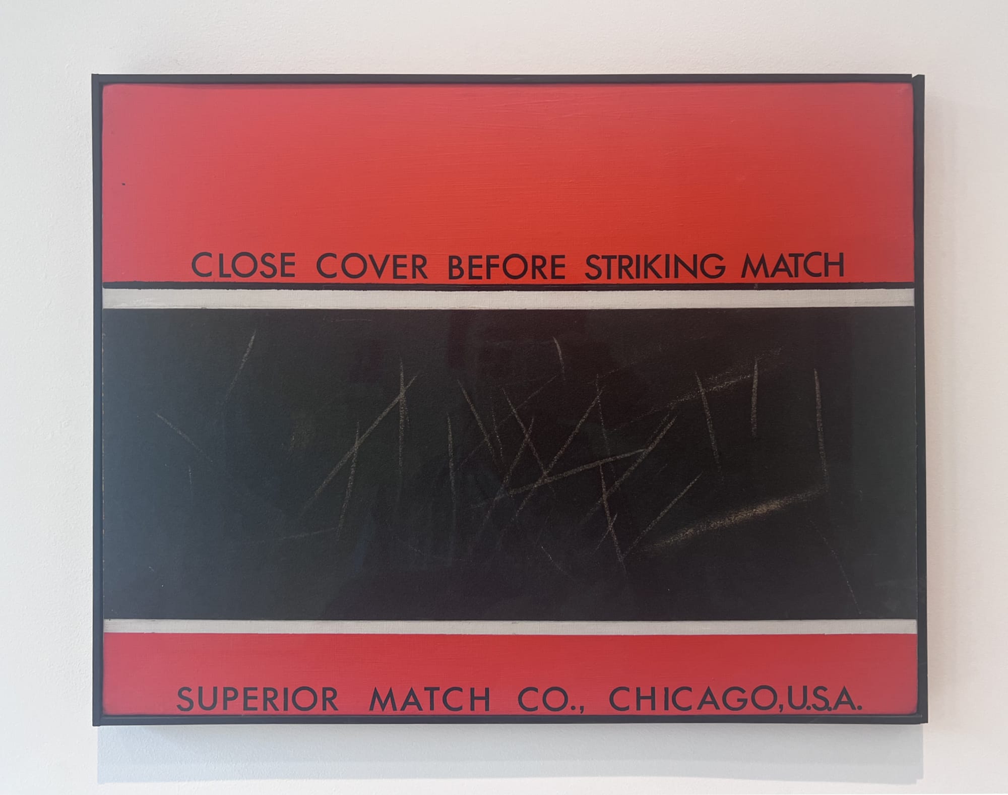 Some of the most successful pieces reinforce the idea that we move through a flood of language and its fragments in the form of advertising, signage, and information (and though not explicitly mentioned, digital media and scrolling). Andy Warhol’s acrylic and collage on linen work “Close Cover Before Striking” (1962), depicting a matchbook cover with the titular words, along with etched scratches on the charcoal-gray striking surface, for instance, suggests a form of conversation between the manufacturer’s printed directions and the consumer’s mark-making. A pair of untitled 2008 paper works by David Salle incorporates fragments of what look to be advertisements, recalling the found poetry that appears in peeling layers of pasted-over subway ads.