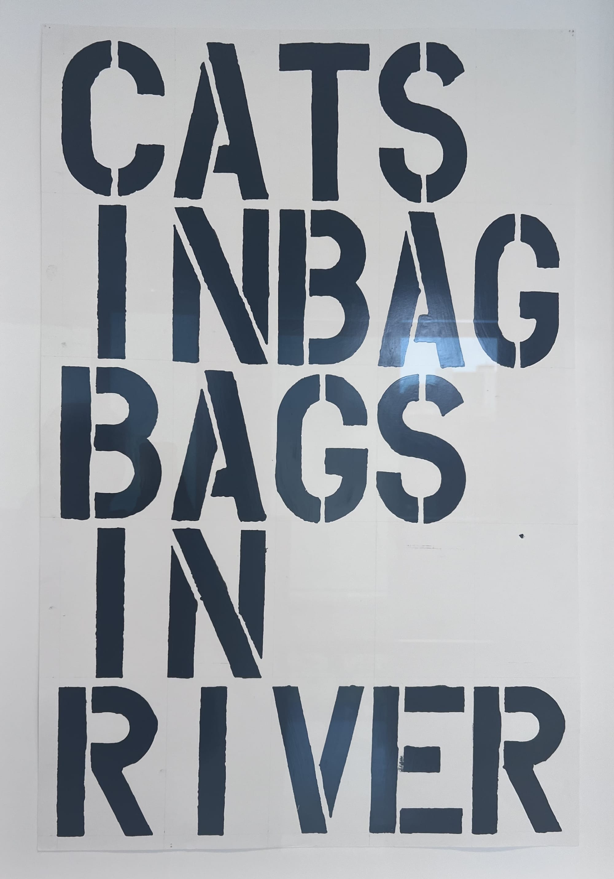 The exhibition all but loses me entirely in the nook across from this installation, which pairs a photo of Joan Didion holding a cigarette with “Rieuse,” an 1890 sculpture by Medardo Rosso portraying a laughing woman. Beside that is a quote by Didion on Norman Mailer’s The Executioner’s Song (1979) about the “vast emptiness at the center of the Western experience… a dread so close to zero that human voices fadeout [sic]....” Silence as a form of exhaustion, of defeat? Or maybe we’re supposed to laugh in the face of nihilism, like Rosso’s bust? That photo of Didion is placed high up in the corner, mirroring Kazimir Malevich’s intentional installation of his “Black Square” (1913) in a high corner, a typical position of Russian religious icons — is it punning on her status as a literary icon? Is it just me who has no idea what’s going on here? Silence as “everything and nothing speak[ing]” to me, indeed. Is that the point? If so, what’s the point? Fittingly enough, my restless ruminations on this one vexingly inscrutable installation might be best summed up by another work in this generally evocative and compelling show. Stenciled in bright blue letters in Christopher Wool’s “Untitled” (1990) are the words: “Cat's in bag; bag's in river” — there seems to be some kind of secret to unlocking the meaning here, but it’s lost on me.
