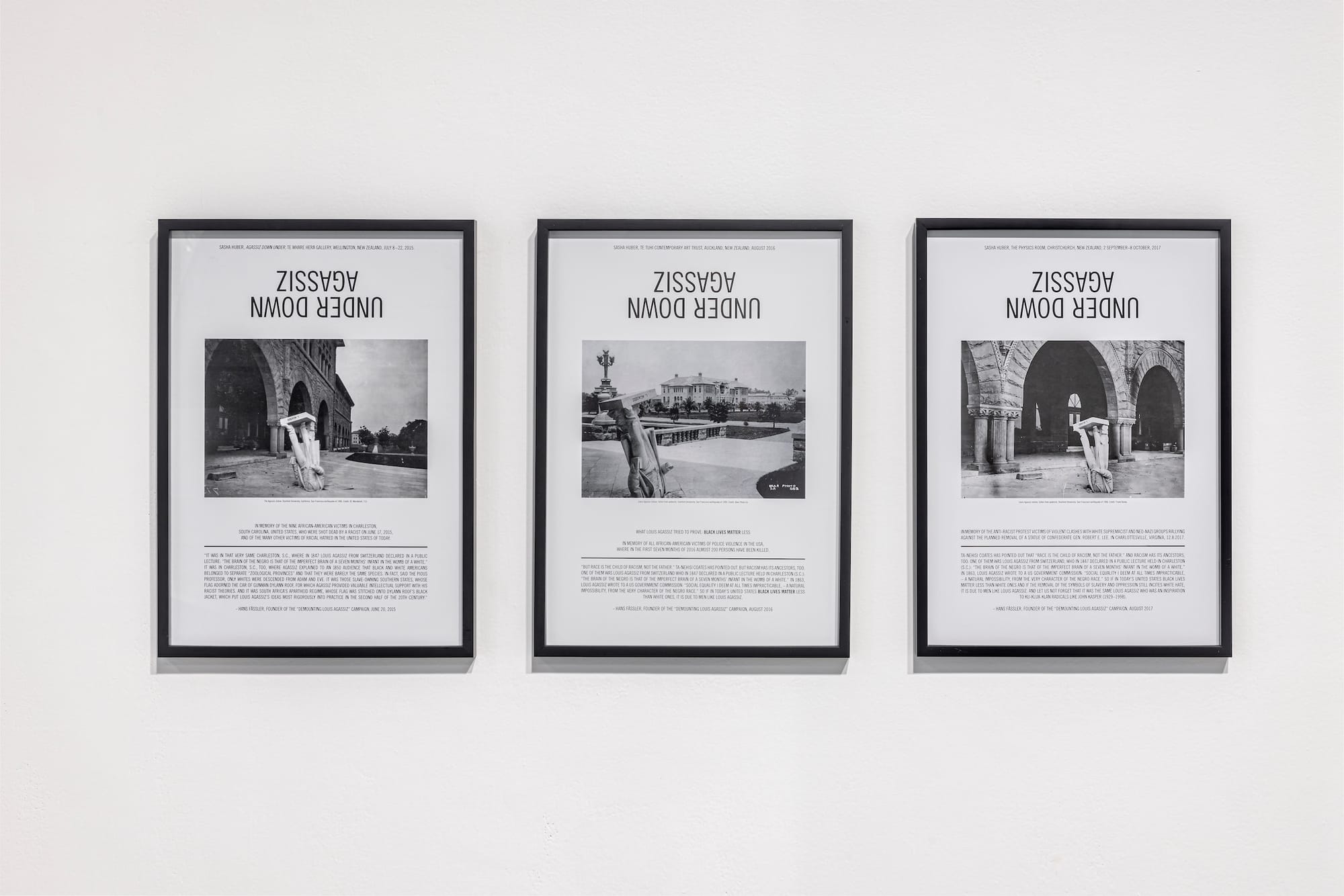 In 2015, while completing an artist residency in earthquake-prone Aotearoa (the ancestral Māori name for New Zealand), Huber learned that the 1906 San Francisco earthquake had toppled a statue of Agassiz at Stanford University. She created “Agassiz Down Under” (2015), a three-poster series using photographs of the upturned sculpture with its head lodged in the ground, both to commemorate recent victims of police brutality and anti-Black violence, and to advocate for the physical removal of monuments representing upside-down ideologies. One poster memorialized the nine Black worshippers massacred in a Charleston church in 2015 and included text from Fässler drawing a clear line from the shooter’s racist ideology to Agassiz’s activities in “that very same Charleston,” where after sourcing Renty and the other six from a South Carolina slave labor camp, he gave public lectures about Blacks and whites belonging to “separate zoological provinces.”