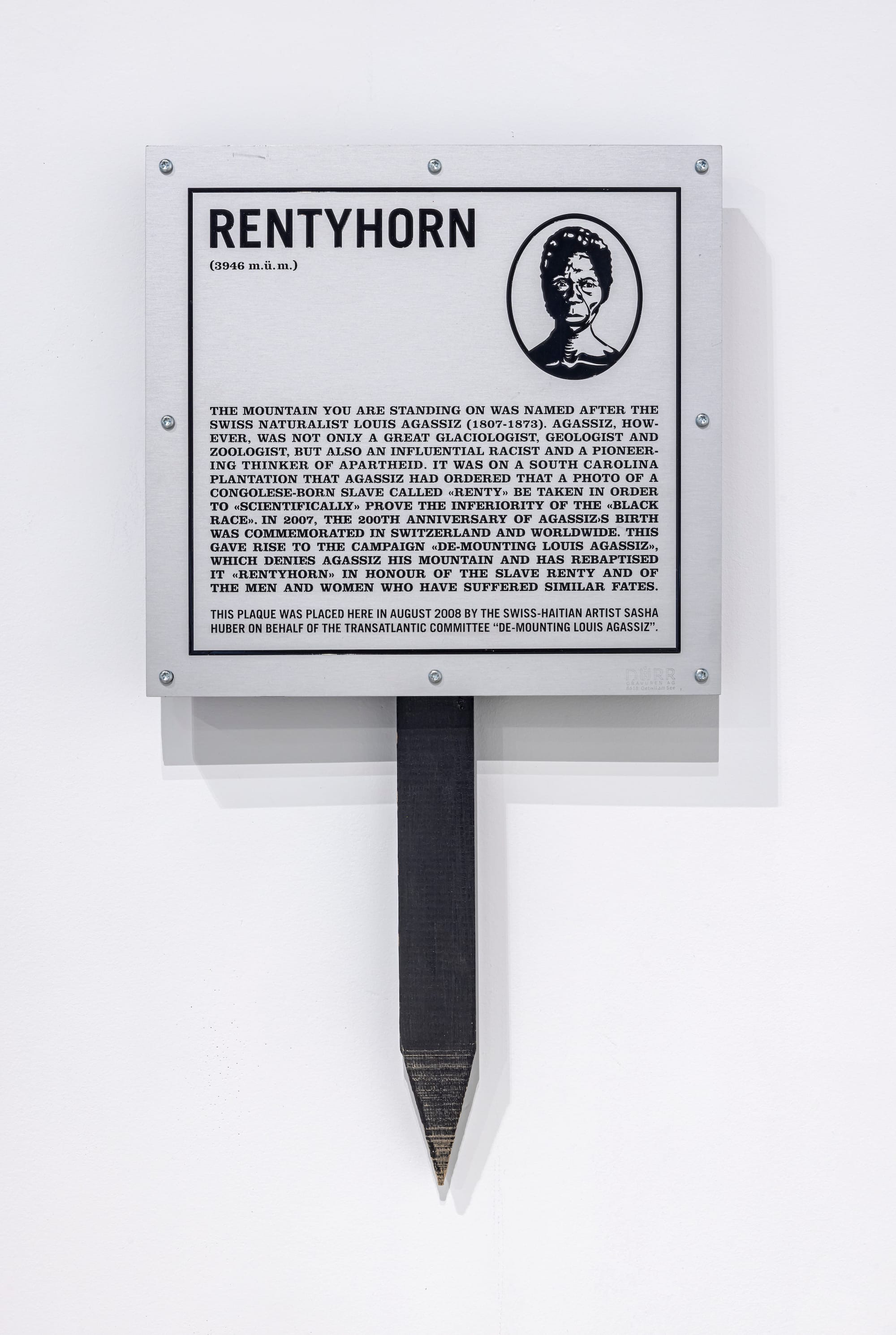 Huber’s involvement in Agassiz’s legacy started in 2007 when she was invited to join the De-Mounting Louis Agassiz Committee, founded by Swiss activist historian Hans Fässler. The Committee was created in response to 200th anniversary celebrations of Agassiz’s birth ignoring his role as a proponent of white supremacy. “At the beginning,” Huber told Hyperallergic, “I didn’t know this will last so long, you know?” As her contribution to the Committee’s efforts to change the name of the Swiss Alps’ Agassizhorn peak, Huber devised her first intervention. The 2008 video “Rentyhorn” depicts the artist summiting the 12,946-foot-high peak by helicopter and installing a metal plaque portraying Renty Taylor. Upon hearing about the campaign, which also included a website and letters to Swiss mayors and UNESCO, descendant Lanier brought her daughters to Switzerland to meet Huber.