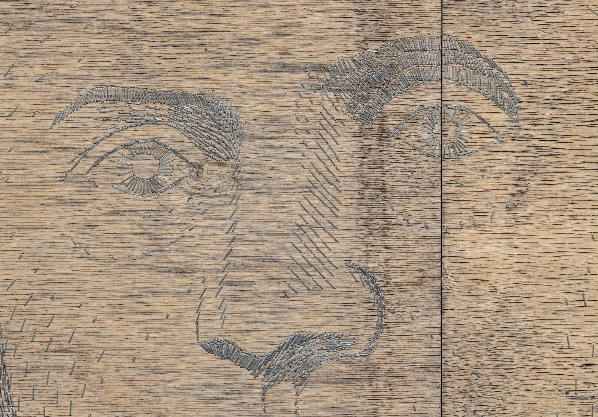 Her latest pieces signal both a return to Renty portraiture and a new direction in technique. “In 2008, I made a drawing of Renty, who was stolen from Congo, in Congolese dress,” she explained, “but it was an ink drawing. Now it’s the first time I marry staples and photographs.” Huber developed her signature stapling technique, which she calls pain-things, in 2004 with the “Shooting Back Series,” using an air-pressured staple gun like a symbolic weapon to speak about unequal power dynamics. Eventually she decided to stop portraying people like Agassiz, “because the end result is a beautiful portrait, you know? So I completely shifted, and I started to portray people who were negatively affected by colonialism, people whose histories have been muted.”