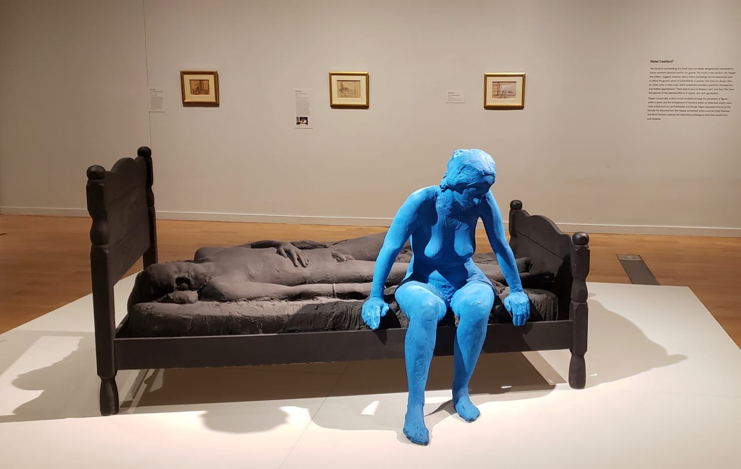 I spend a good part of the next day thinking about who thought this was a good idea. I have to admit that the freshness of the exhibition is constituted in its pairing the soft desolation of Hopper’s portraits with work by other artists who were not painters. The best inclusions for me are William Eggleston’s “Hunstville, Alabama” (1970) and George Segal’s “Blue Girl on Black Bed” (1976), and Susan Worsham’s “Marine, Hotel Near Airport, Richmond, Virginia” (2009). Each of these works shows an individual sitting on a bed, but making a more nuanced pitch for the viewer’s attention, offering more than loneliness or grief, an interior life that bobs to the surface of the face. However, none of the rest of the exhibition framework makes sense.