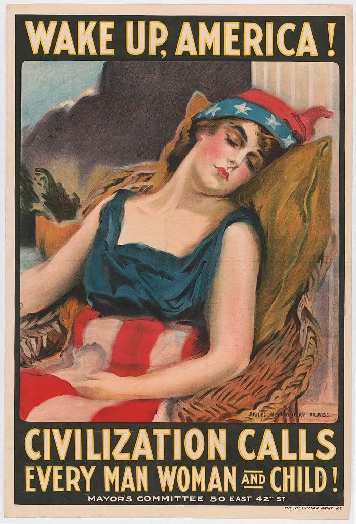 Two established personifications of the United States were available to illustrators in 1917–18, and both were updated and pressed into service: Columbia, a youthful woman, representing liberty; and Uncle Sam, a vigorous, white-tufted, old man who exhorts his nephews to defend the country. One illustrator in particular milked both of these characters for poster concepts. James Montgomery Flagg cranked out “Wake Up, America!” within weeks of the U.S. declaration of hostilities.