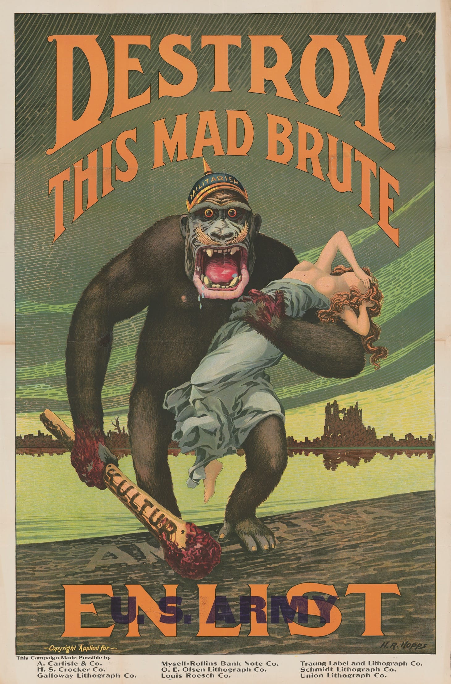 Finally, a kind of beastly personification was used to characterize the enemy. The “hun” was repeatedly depicted as insatiable fiend, never more vividly than in Harry Hopps’s “Destroy this mad brute” poster. A rampaging gorilla in a Kaiser helmet with matching mustache has come ashore, having ravaged the desolate city behind him. His right hand brandishes a bloody club labeled Kultur, while his left arm gathers a half-dressed, distraught blonde: the straw-woman, whose honor must be defended at all costs. The brute intriguingly anticipates King Kong, the monster primate to ravage midtown 15 years hence.
