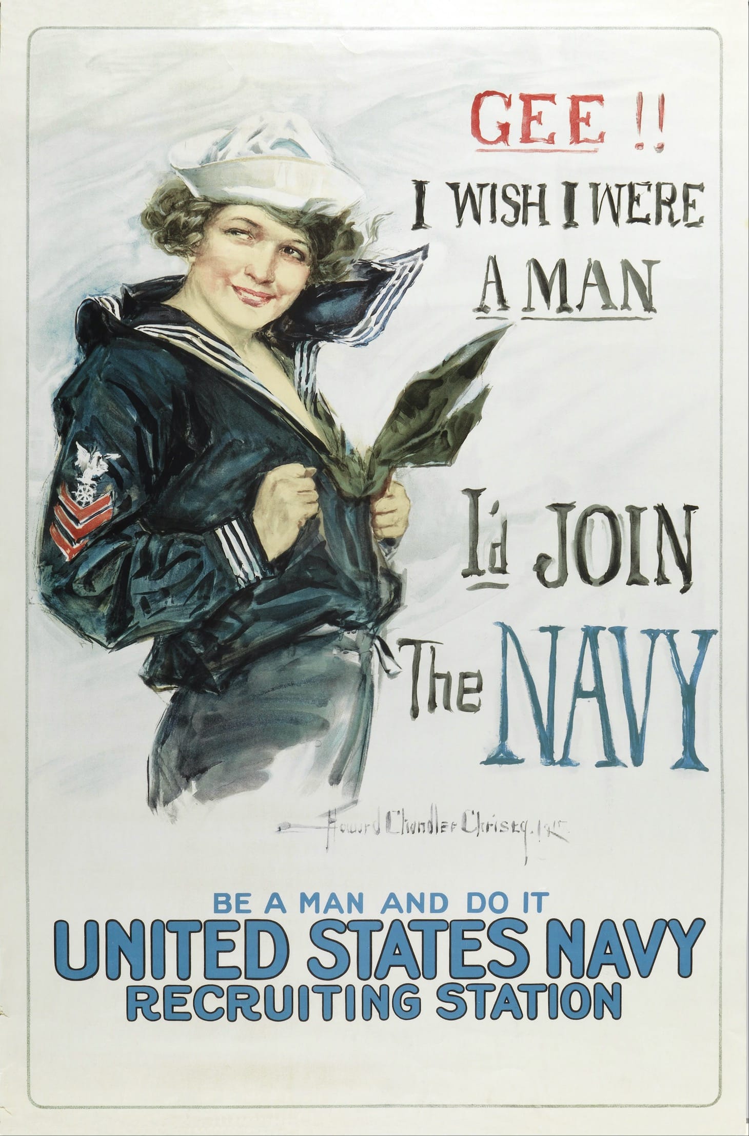 The Gibson Girl was supplanted by a variety of competing “it” girls. All were proto-flappers: slimmer, more animated, s-curve corsets discarded. The contenders included the “Brinkley Girl,” “Fisher Girl,” and “Christie Girl,” the work product of Nell Brinkley, Harrison Fisher, and Howard Chandler Christie, respectively. All contributed to the war effort. But Howard Chandler Christie secured the attentions of the United States Navy, for whom he produced nearly every recruiting poster during the war. Christie’s women exhort, coax, and event taunt men into volunteering for service. “Gee!! I wish I were a man,” dreams a woman in a sailor suit, “I’d join the Navy.” The typeset copy lowers the boom: “BE A MAN AND DO IT.”