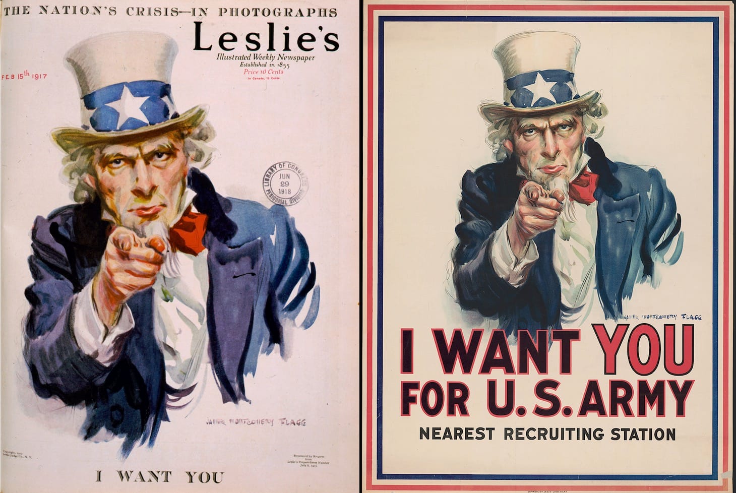 James Montgomery Flagg rebooted Uncle Sam far more memorably. He famously used himself for a model, giving the old character (dated to the war of 1812, updated by Thomas Nast in the 1860s) a freshly gruff mien for his first appearance on the cover of Leslie’s Illustrated News. The pointed finger, stern look and dandy costume were all there, over a legend of “I WANT YOU.” A second version of the same drawing executed in a larger scale for the Division of Pictorial Publicity came later in the year, with “For U.S. Army” appended to his lettered demand. Although Flagg would produce over 40 posters during 1917–18, with many featuring Uncle Sam, none would outperform I WANT YOU, which sold over four million copies in two years.