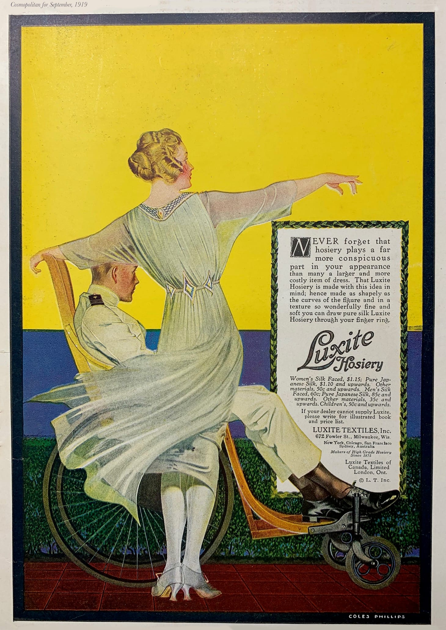 The birth of the consumer economy and the emergence of modern advertising mark the early 20th century. The skills used to sell baking powder, Jell-o, and cosmetics were applied to the promotion of armed conflict. Sometimes those agendas intermingle, and the results can be jarring. In a discomfiting 1919 ad for Luxite Hosiery, we see the flip side of wartime propaganda after the fact. The sexy Navy recruiter who “wishe[d] she were a man” has re-embraced angelic femininity. Gesturing grandly if delicately, her attentions are nominally devoted to the sailor she urged to sign up, convalescing in a wheelchair. He serves as a patriotic prop. She has been reborn as a fashionable caregiver with great legs.