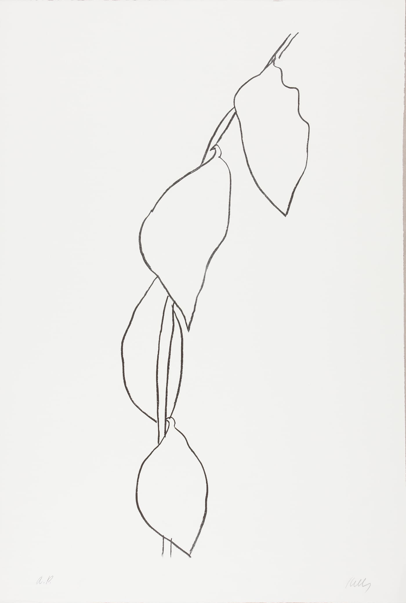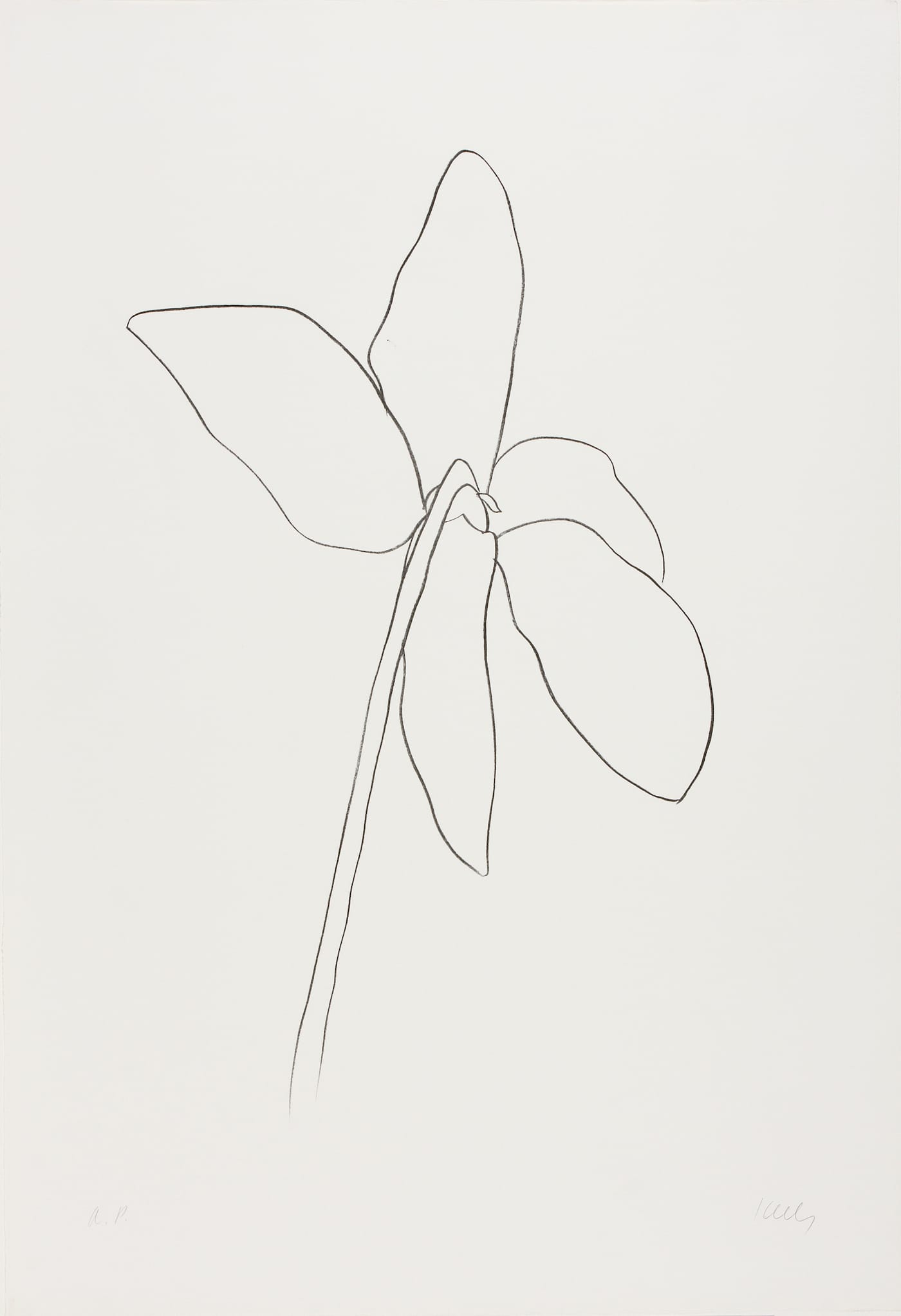 Kelly first spent time in France in 1943, where he served during World War II; five years later, he moved to Paris. In these early years in his artistic career, artists like Pablo Picasso, Henri Matisse, Jean Arp, and Constantin Brancusi became referents for Kelly, influencing the type of abstraction he would embrace. During this transition, Kelly began to make observational crayon and ink line drawings of plant life. These gestural sketches distilled the natural world into line and shape, and became a form of artistic study that would define Kelly’s work across mediums and throughout his career.