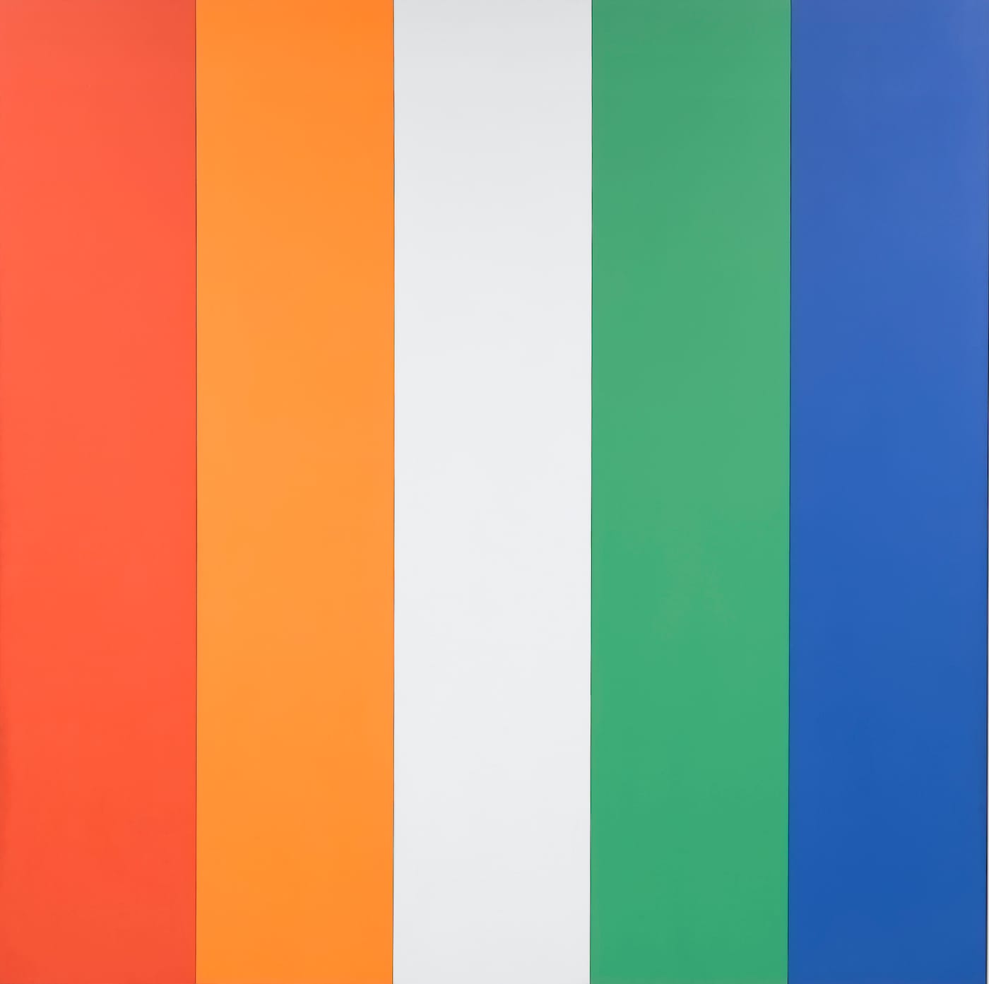 There are two large-scale color field works featured in the exhibit, “White over Blue” (1967) and “Red Orange White Green Blue” (1968), that demonstrate how Kelly’s artistic language eventually moved beyond the pictorial frame. Where the line in Kelly’s depictions of plant life functions as a tool for drafting a language of abstraction that ceaselessly considers the relationship between figure and background, in his paintings, sculpturally shaped canvases of a single color become the delineating form, and the gallery wall the background.