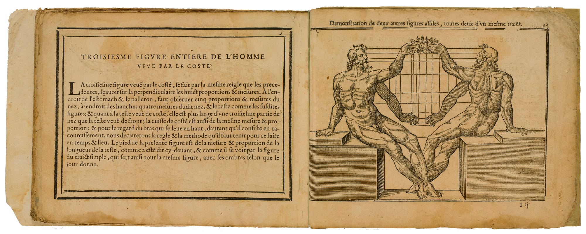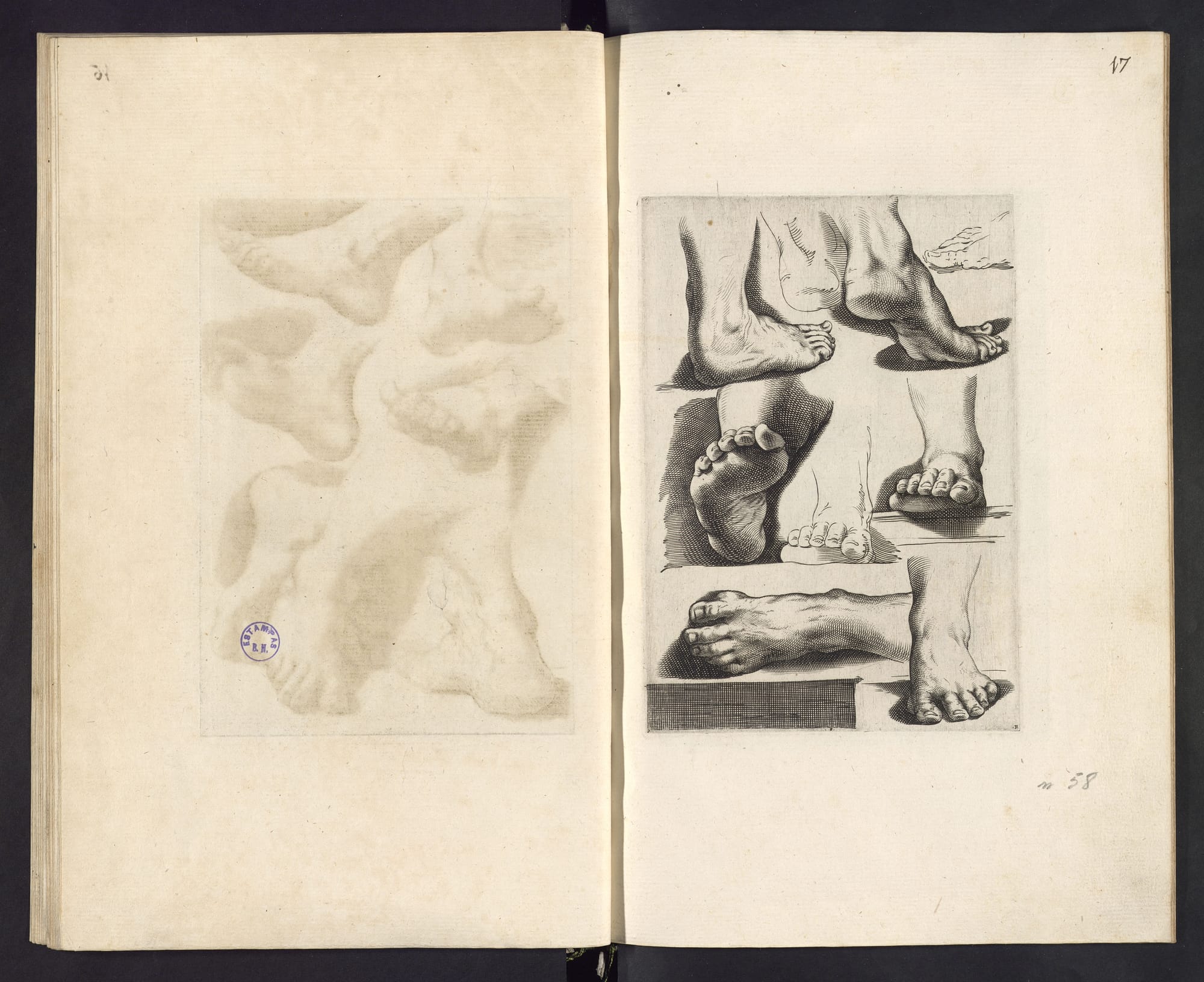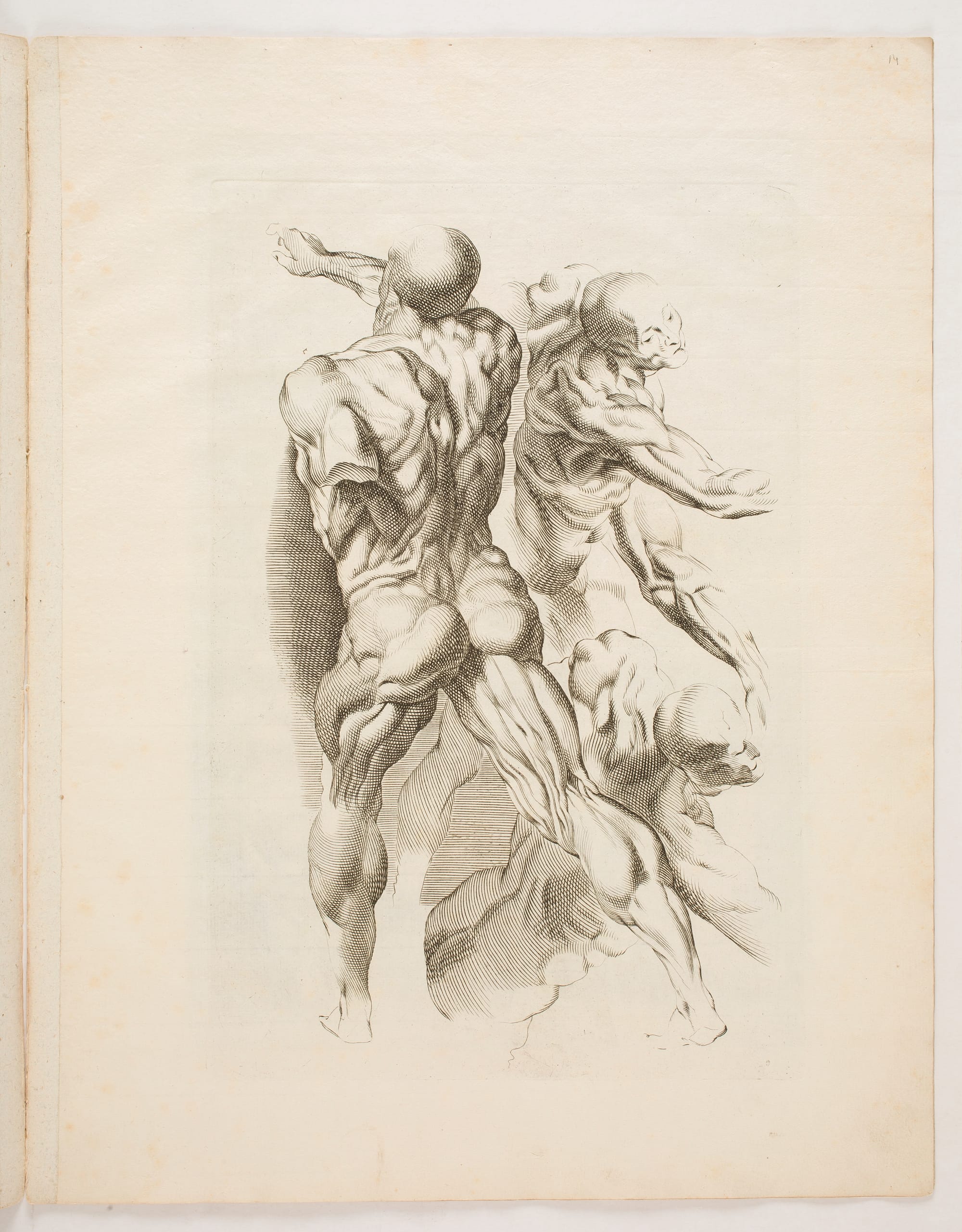 There were predecessors to Fialetti’s drawing book. For instance, Albrecht Dürer’s 1528 treatise on drawing and Andreas Versalius’s 1543 anatomy book offered artists insight into the human figure. But drawing books that broke down the human body in full-page, straightforward illustrations were more affordable, widely circulated, and practical than previous instructional materials. Also known as manuals of principles, they consisted of engravings and etchings by master artists, sometimes accompanied by texts on technique and style. Because of their fragile construction, thin paper covers, simple binding, and intensive use, well-conserved drawing books are hard to come by these days, and rarely studied. However, the Prado has assembled over 100 examples of drawing books and the sketches they inspired across three centuries. The majority are from the museum’s own library, which houses one of the world’s most important collections of this often-overlooked field.