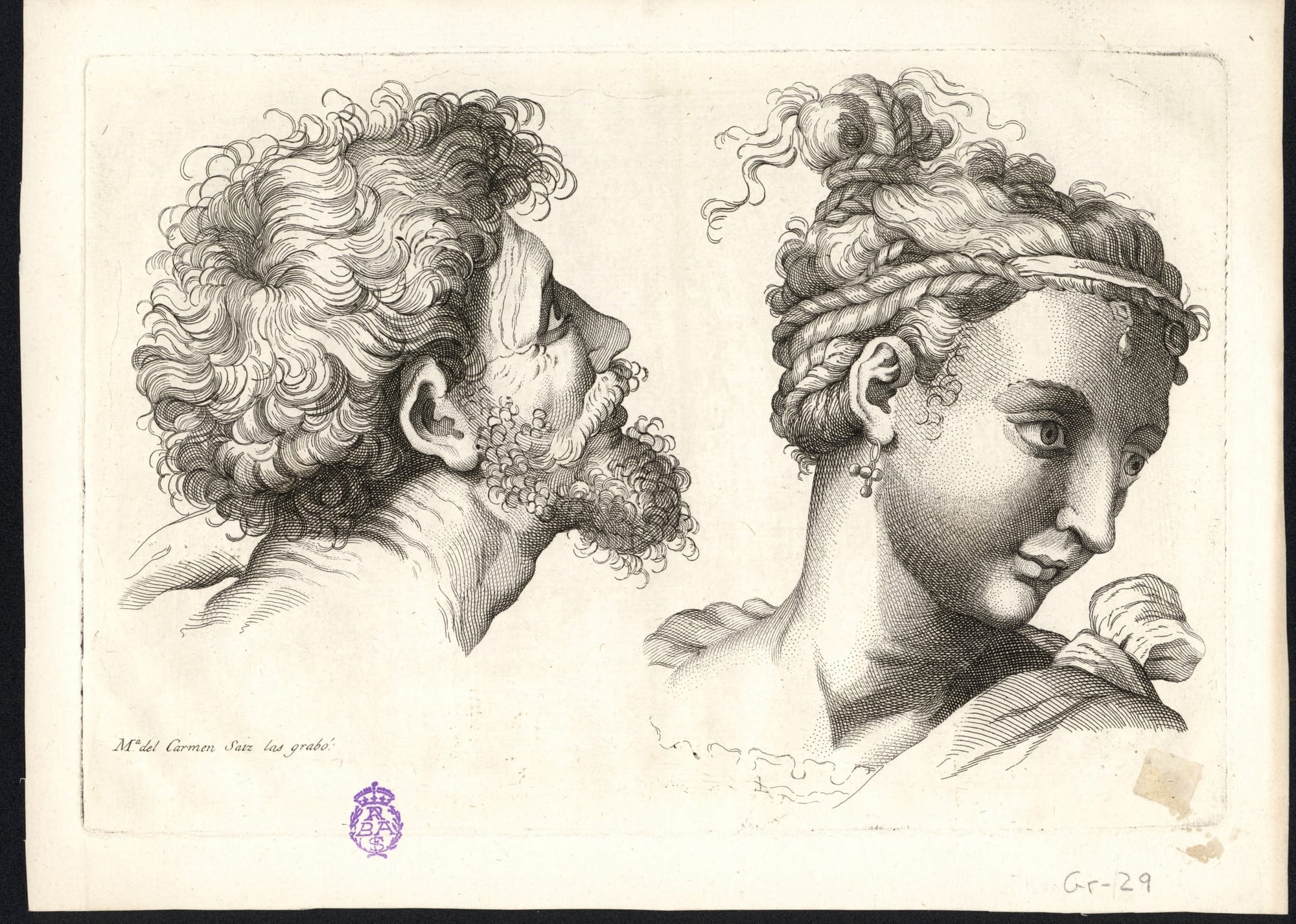 Etching and engraving are precise, multi-step processes. They’re fitting mediums for these systematic drawing guides, which emphasize repetition and accuracy over exploration or expression. That said, the books’ creators kept aesthetics in mind. Bulging eyes, gaping mouths, warts, wrinkles, and other disembodied expressions or body parts are arranged in elaborate configurations that are at once delightful and disconcerting. Male and female figures appear equally across the pages, presenting both as valid subjects of study. And María del Carmen Saiz’s 1816 drawing book — the only one by a woman — is a reminder of how these books might have made drawing more accessible to women across Europe, even if their creations remain largely anonymous or forgotten.
