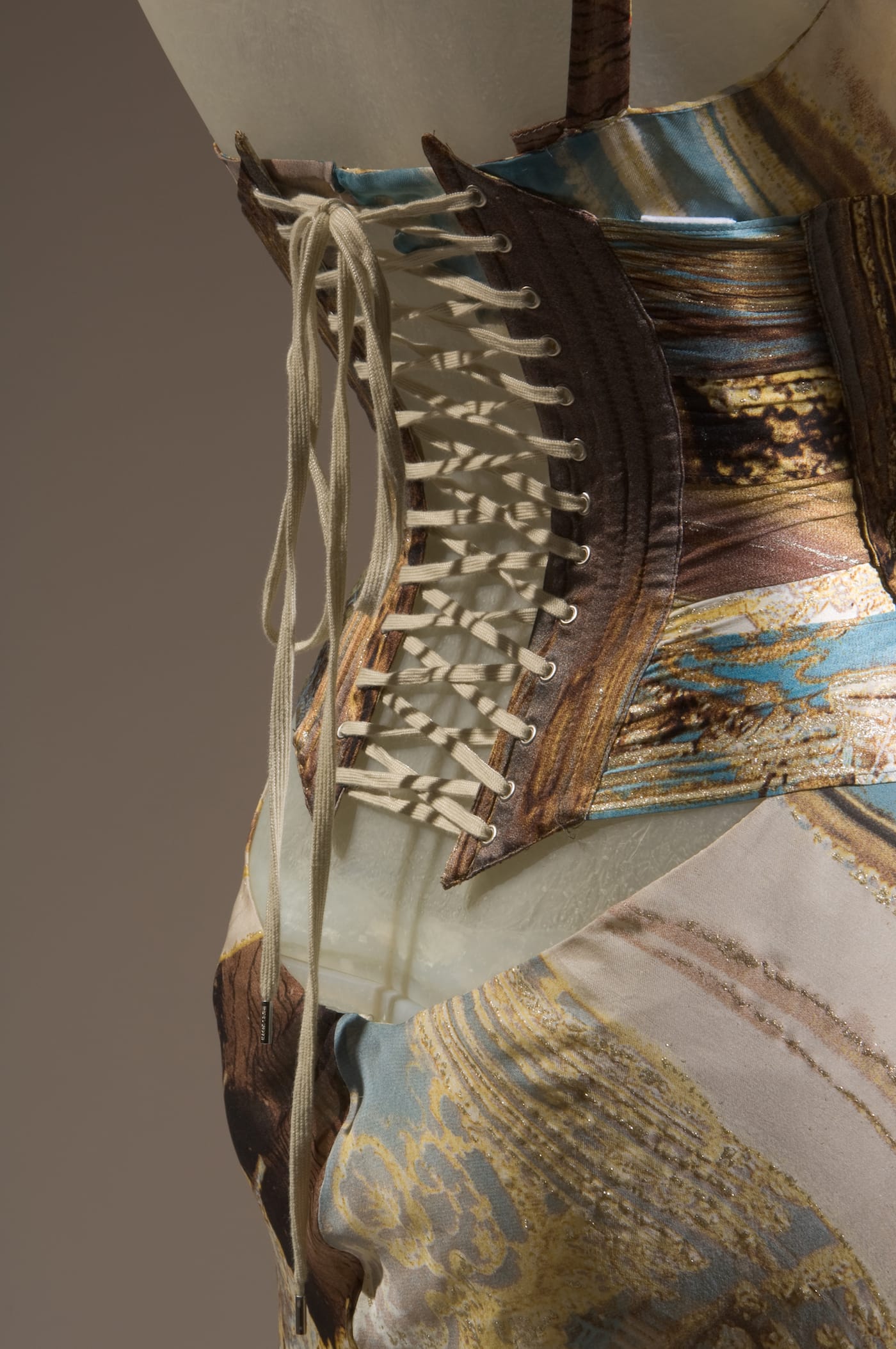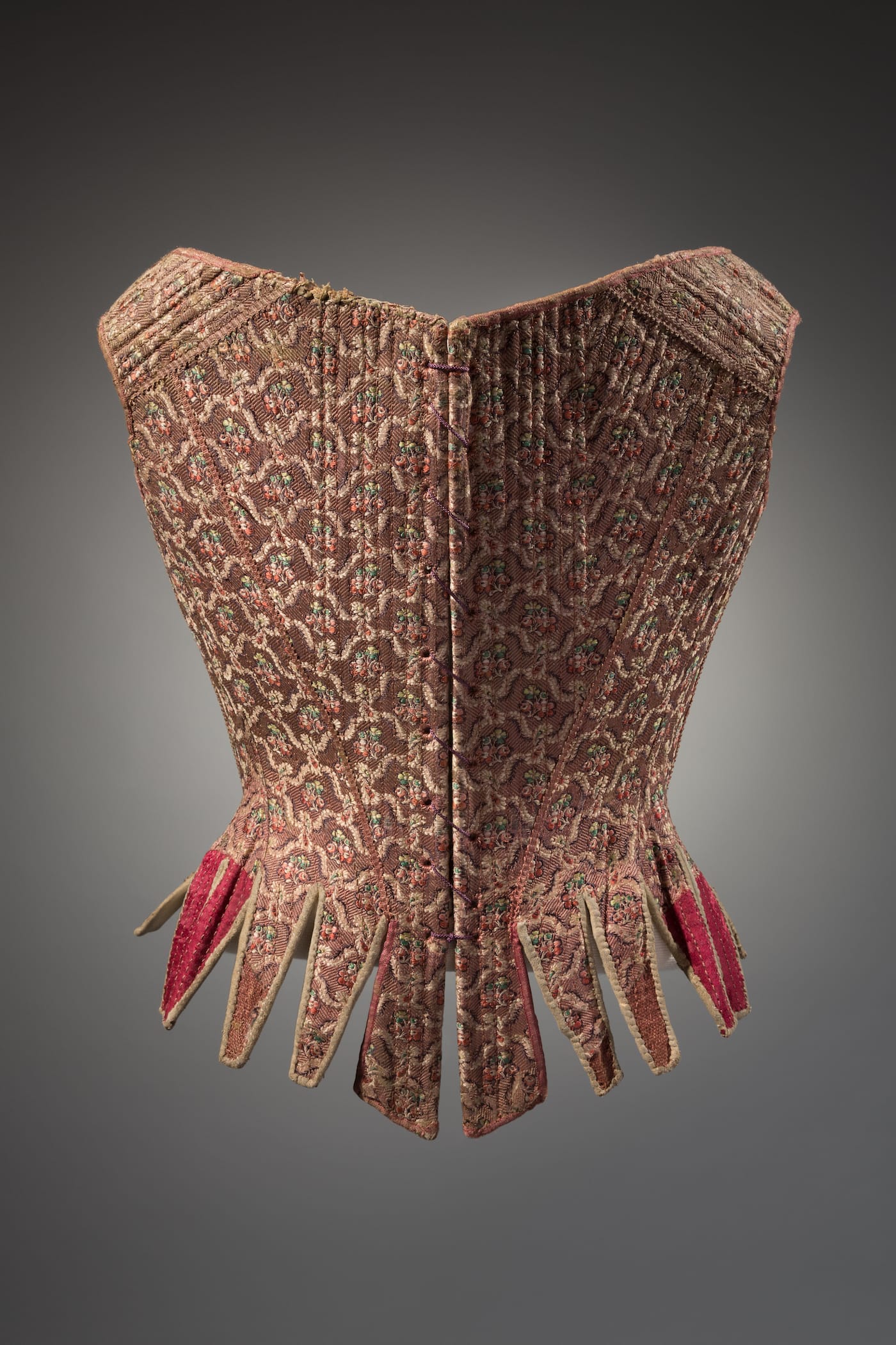 Upon first glance, The Body, which features 60 items from the museum’s permanent collection, might seem like a condensed timeline of fashions, detailing the ideal silhouettes and trends from the late 1700s to our time. However, as visually striking as the selection of dresses might be — from a brick-pink brocade dress from the late 1800s that sports an 18-inch waist offset by a 31-inch bust, to an emerald-green sculptural ballgown by Charles James — The Body is more than a chronological display of pretty silks, laces, and sequins. Rather, the exhibit stresses how, throughout the centuries, women in Western culture have been forced, even physically constricted, into molding to bodily ideals.